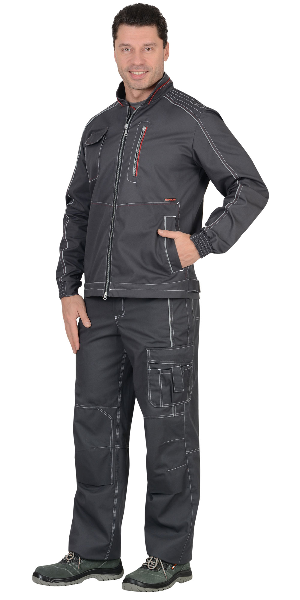 Куртка короткая, воротник стойка; с центральной застежкой на тесьму "молнию"; с внутренней подпланкой; с верхним прорезным карманом на тесьму "молнию" на левой полочке, и с верхним накладным полуобъемным карманом с фигурным клапаном застегивающийся на потайную липучку на правой полочке; с нижними прорезными карманами "листочки", притачной обтачкой низа куртки и манжетами, манжеты частично стянуты резинкой. В куртку предусмотрен СВ кант для обозначения сигнальной видимости