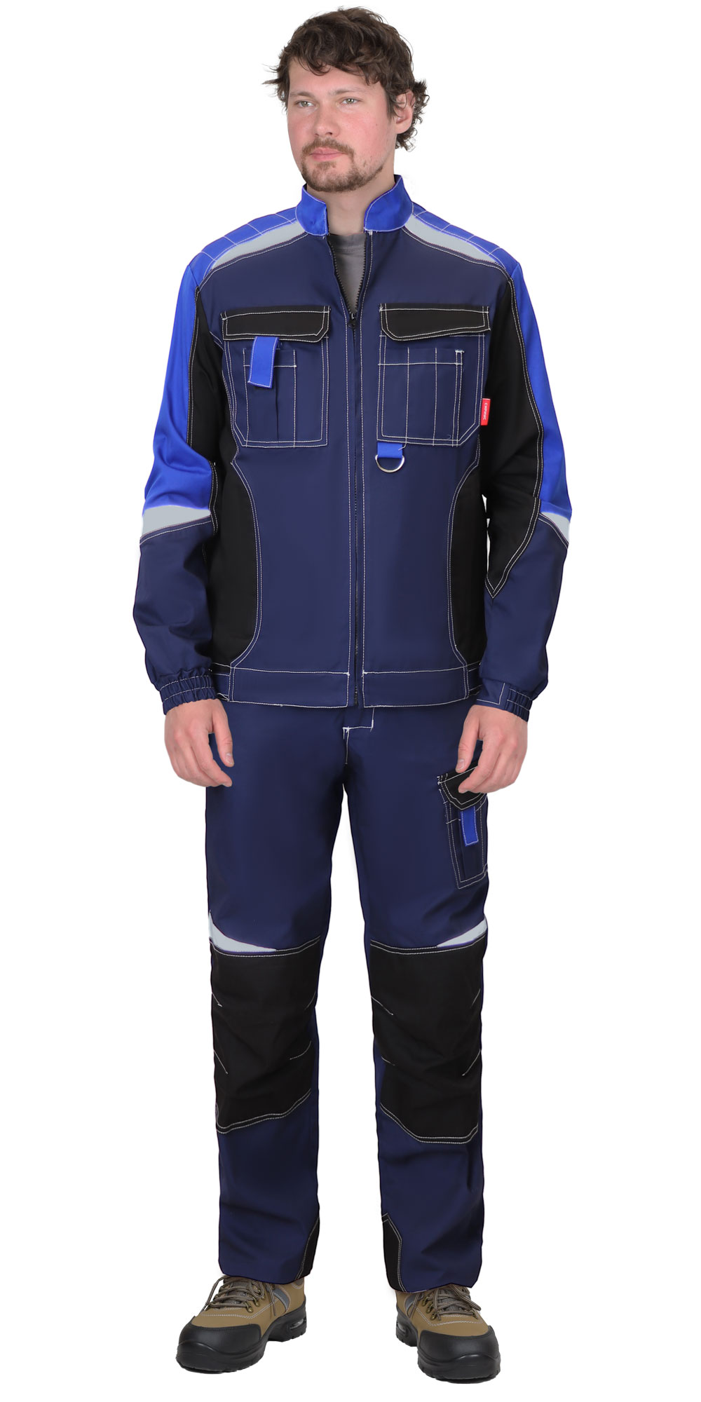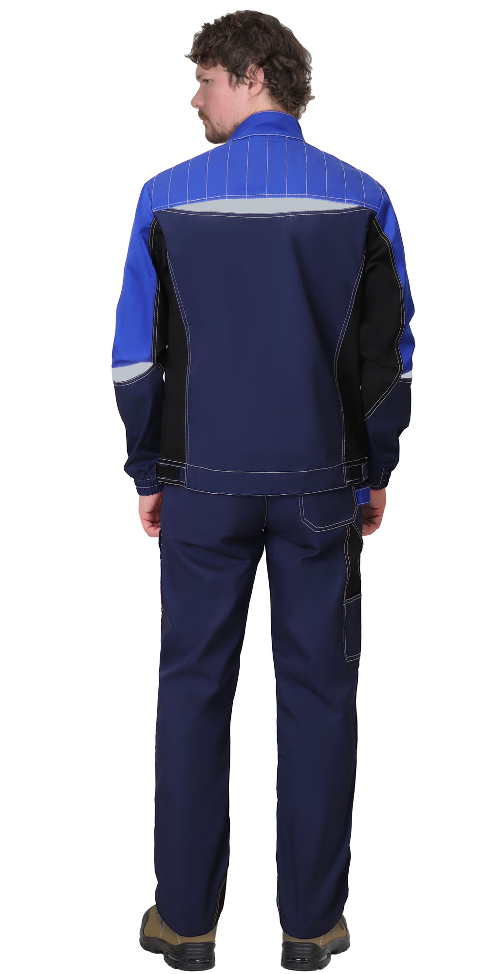Куртка трёхцветная, прямого силуэта, укороченная, с воротником стойка, с центральной застёжкой на молнию от горловины до низа. С нагрудными накладными карманами с клапанами, с нижними прорезными карманами, с молнией. Рукава втачные, с отрезной манжетой, частично собранный на резинку. Объём по низу куртки регулируется хлястиками с текстильной застёжкой «липучка». В куртке предусмотрены светоотражающие элементы.