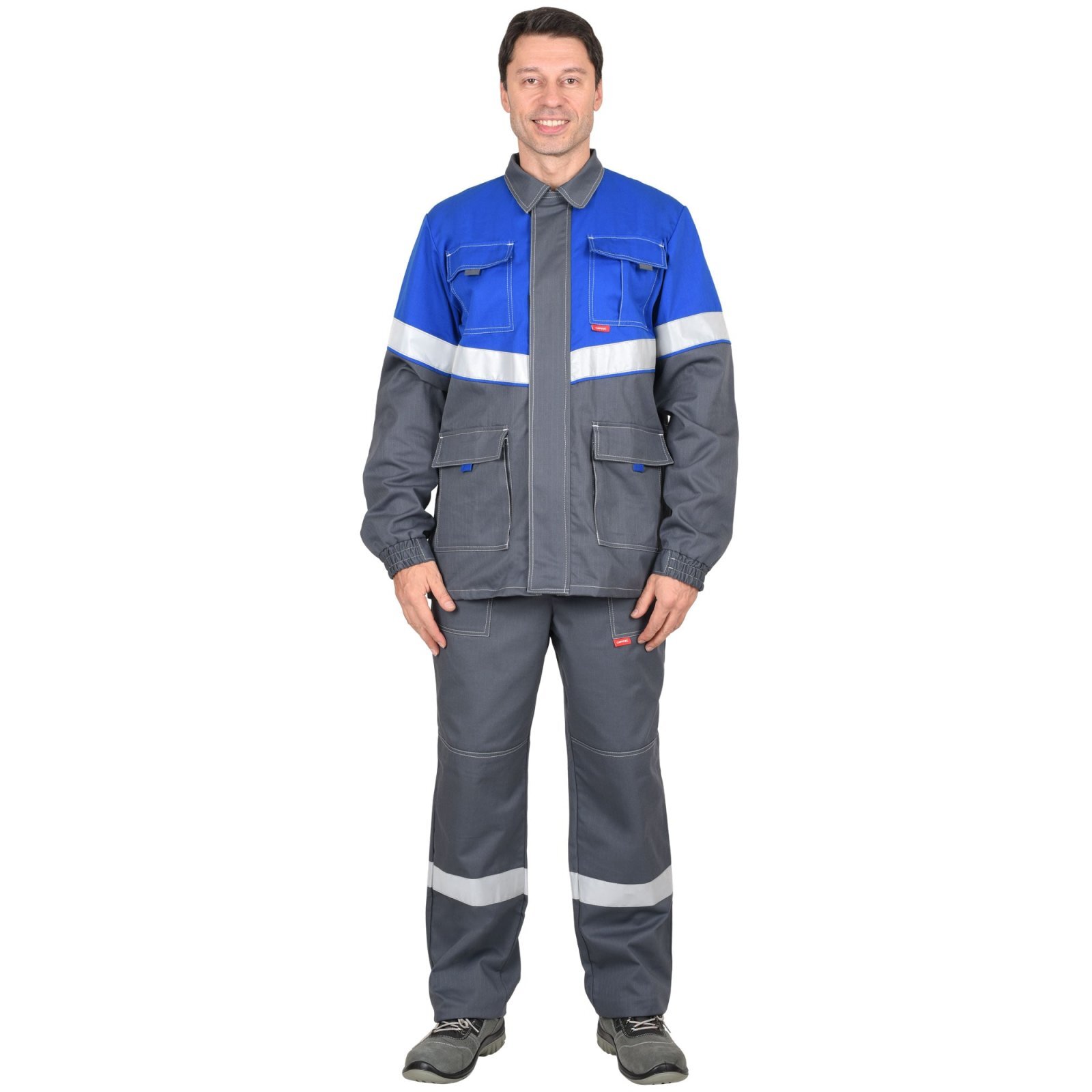 Куртка длинная, из ткани Антистат Комфорт, прямого силуэта, с центральной застёжкой молния с ветрозащитной планкой на липучках, с отложным воротником, верхними и нижними накладными карманами с клапанами застегивающиеся на липучку. Рукава втачные с притачными манжетами частично стянутые на резинку ткацкую, с налокотниками. В куртке настрачивается лента светоотражающая (мелкодисперсная белая) 50 мм для обозначения сигнальной видимости.