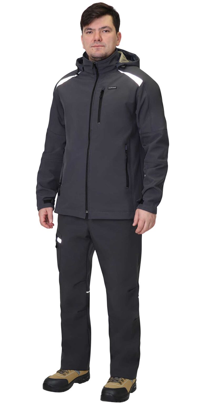Куртка прямого силуэта, без подкладки, с втачным воротником "стойка", с центральной застёжкой на молнию, с длинными рукавами, с тремя прорезными карманами с молнией и съёмным капюшоном на кнопках. Спинка куртки с удлиненным фигурным низом. В куртке на полочках и спинке предусмотрены светоотражающие элементы для обозначения сигнальной видимости в тёмное время суток.