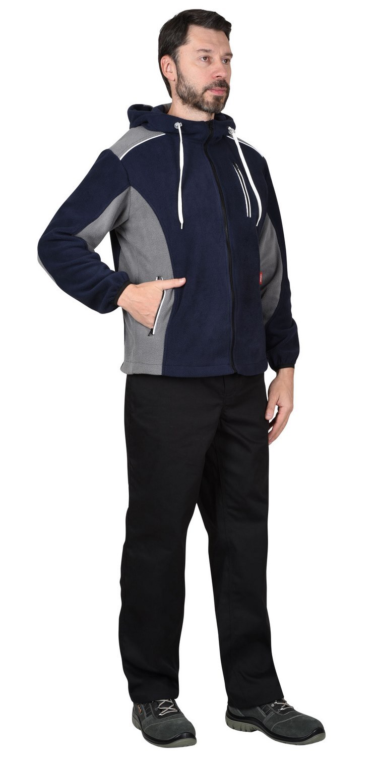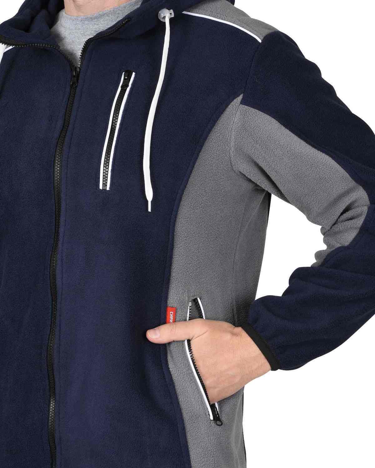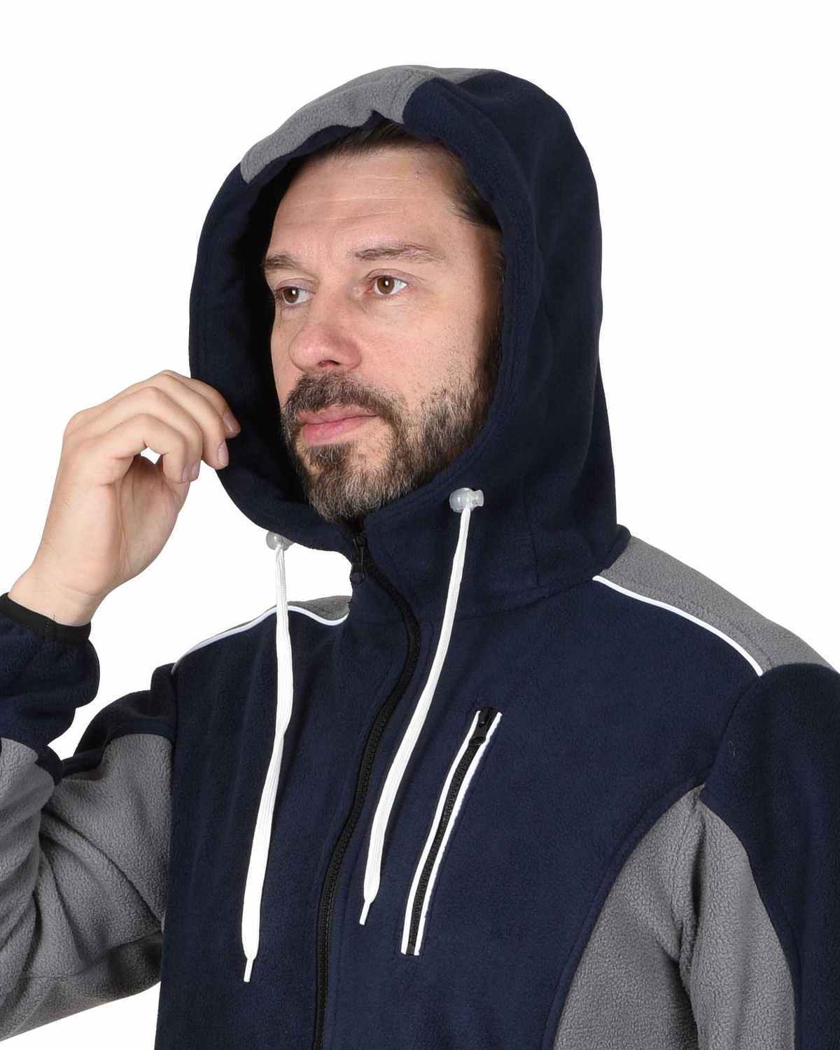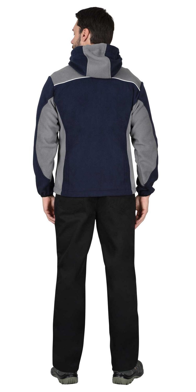 Куртка, комбинированная из флиса двух цветов, без подкладки, прямого силуэта, с центральной застежкой на молнии с втачным капюшоном, с тремя карманами на молнии. Рукава втачные понизу присобраны на окантовочную резинку. Капюшон втачной.
