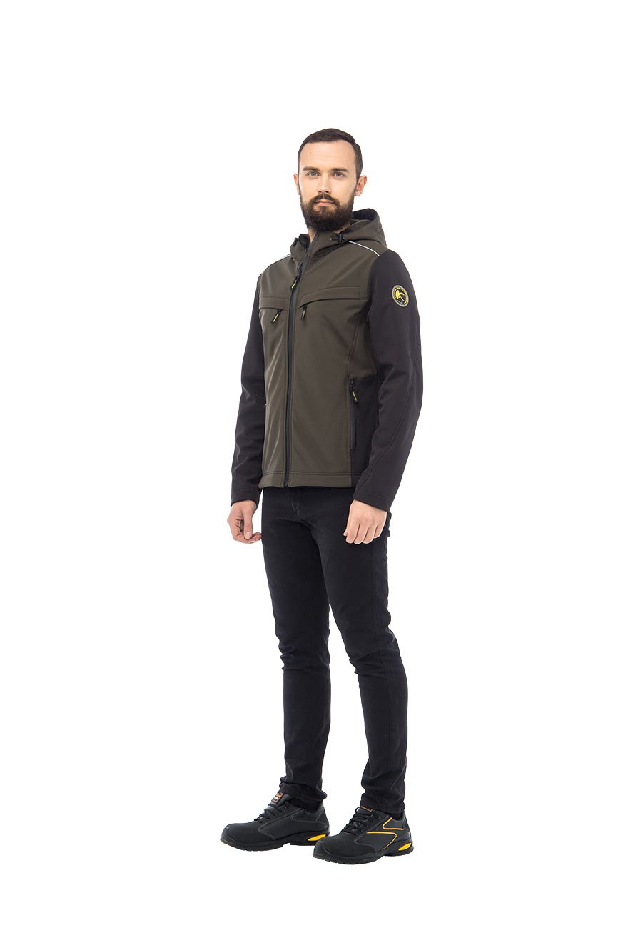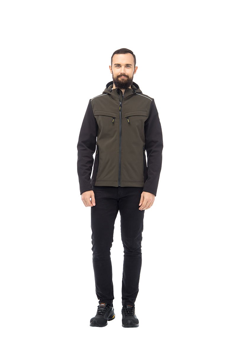 Куртка с капюшоном из трехслойного материала softshell, обладающего высокими ветро- и водонепроницаемыми свойствами. Куртка полуприлегающего силуэта с центральной застежкой на прорезиненную молнию. Верхние нагрудные карманы под кокеткой на молниях, нижние карманы с прорезиненными молниями. Кулиса по низу куртки для регулировки объема. Удобная мягкая внутренняя планка застежки. Рукава втачные эргономичной формы. Люверсы с сеткой для вентиляции в нижней части рукавов. Световозвращающие канты спереди и сзади под кокетками. Капюшон с кулисой по лицевой части для регулировки объема. Внутренние карманы для телефона и документов формата А4. Дополнительный комфорт в носке обеспечивается стрейчевыми свойствами материала (4-way stretch).