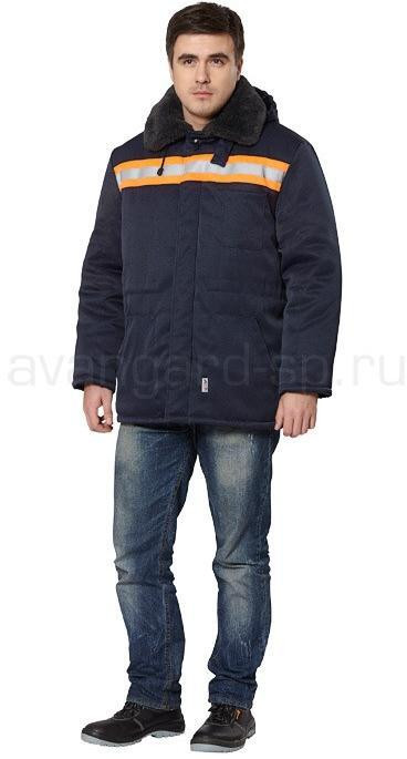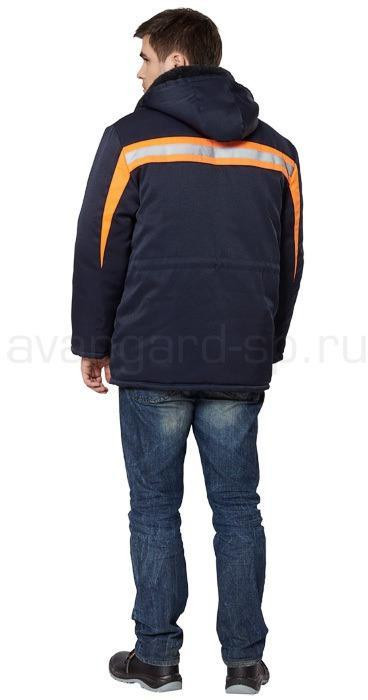 Куртка прямого силуэта, темно-синяя с оранжевой отделкой. Центральная застежка на пуговицы. Воротник из искусственного меха. Отстегивающийся регулируемый капюшон. Вместительные боковые карманы с клапанами. По линии талии пояс-кулиска. Низ рукава регулируется хлястиком, застежкой на пуговицы. Сочетание основного темно-синего цвета с оранжевой отделкой и светоотражающей полосой подходит для работ в условиях плохой видимости.