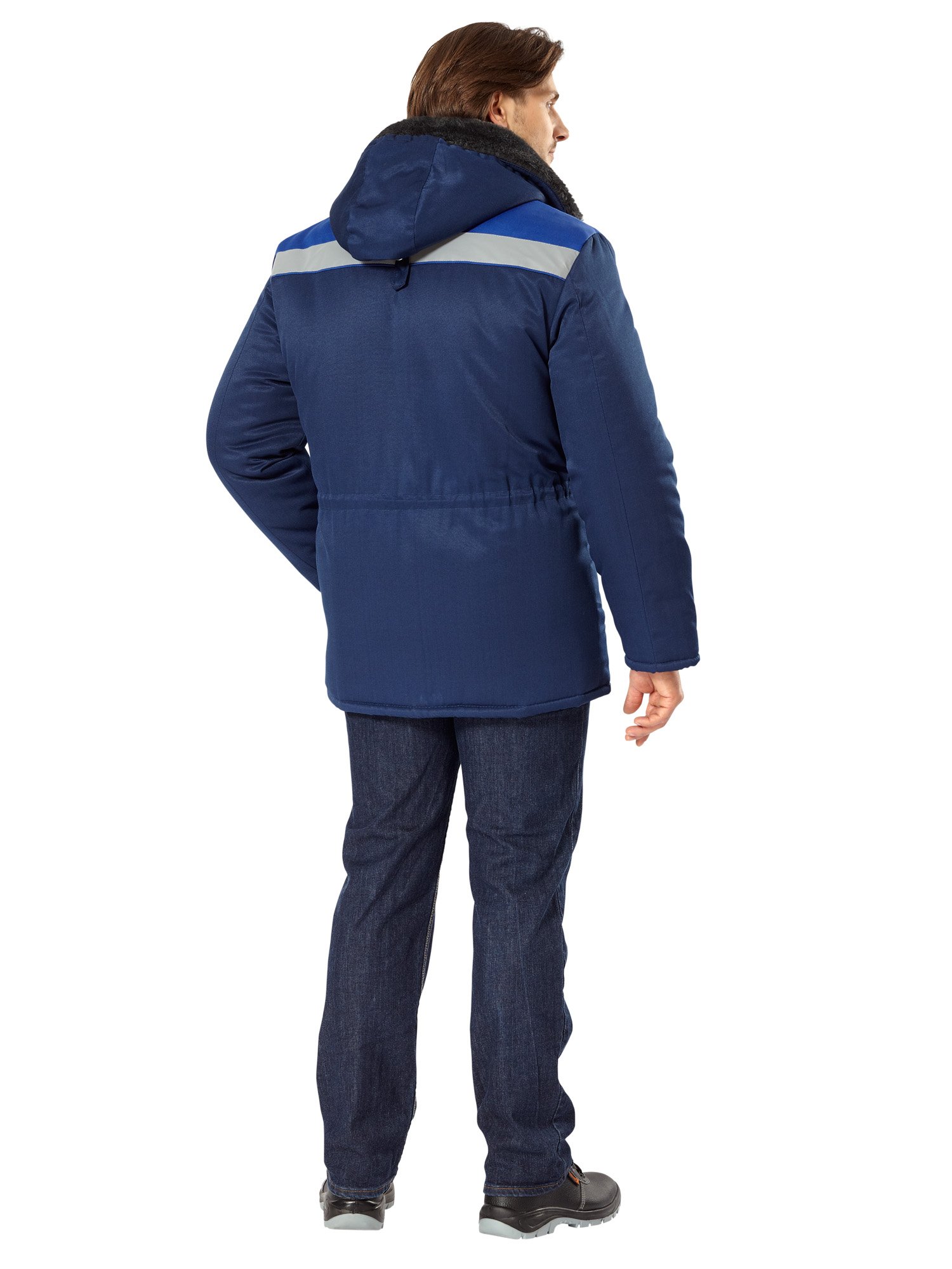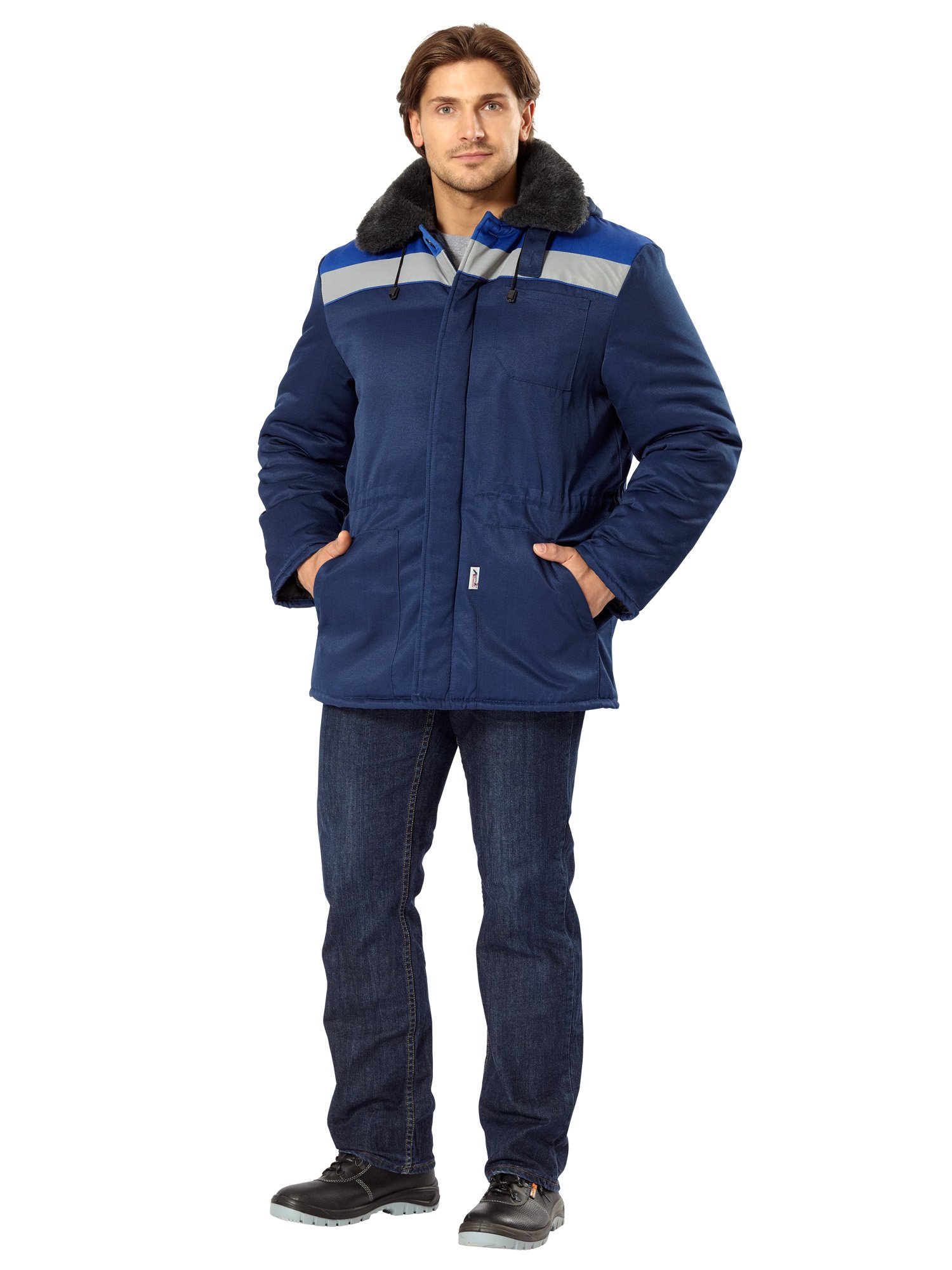 Куртка прямого силуэта, темно-синяя с васильковой отделкой. Центральная застежка на пуговицы. Воротник из искусственного меха. Отстегивающийся регулируемый капюшон. Вместительные боковые карманы с клапанами. По линии талии пояс-кулиска. Низ рукава регулируется хлястиком, застежкой на пуговицы. Сочетание основного темно-синего цвета с оранжевой отделкой и светоотражающей полосой подходит для работ в условиях плохой видимости