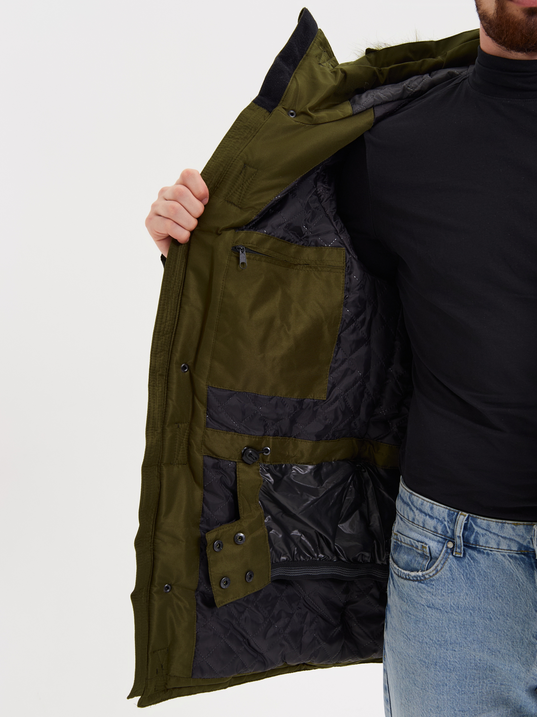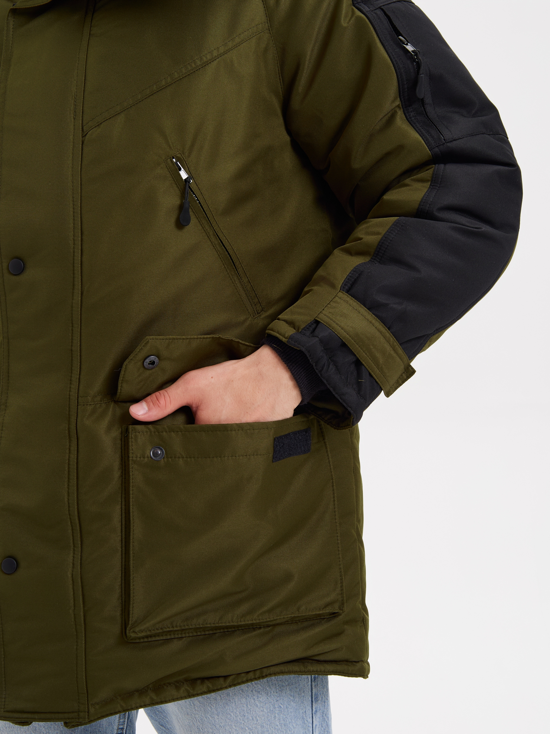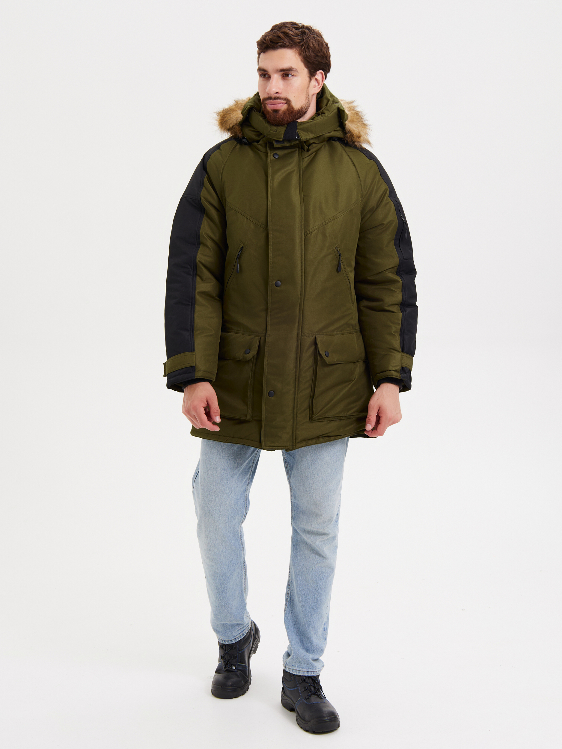 Застежка на двухзамковую молнию и ветрозащитный клапан. Капюшон со съемной опушкой из искусственного меха (енот) стягивается шнуром. Рукава с полушерстяными напульсниками, регулируются по ширине патой. Утепленные флисом нагрудные и боковые объемные карманы, накладной карман на левом рукаве, внутренние карманы, под ветрозащитным клапаном – потайной карман с молнией (для планшета и документов формата А4). Внутренняя ветрозащитная юбка.