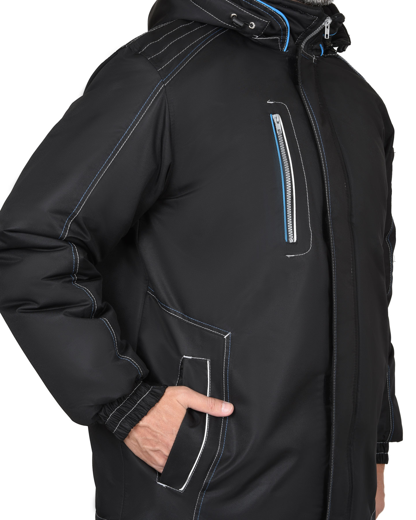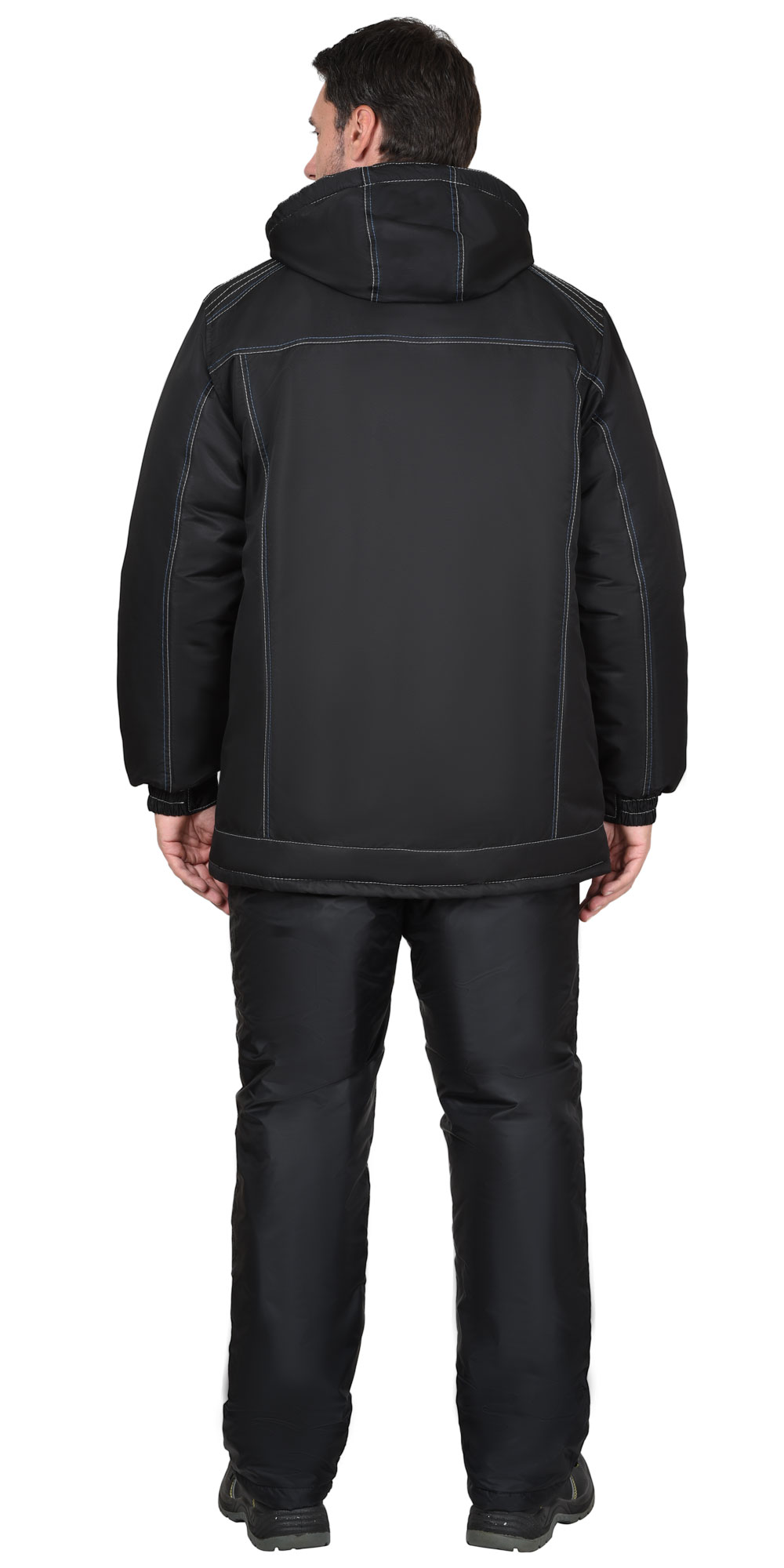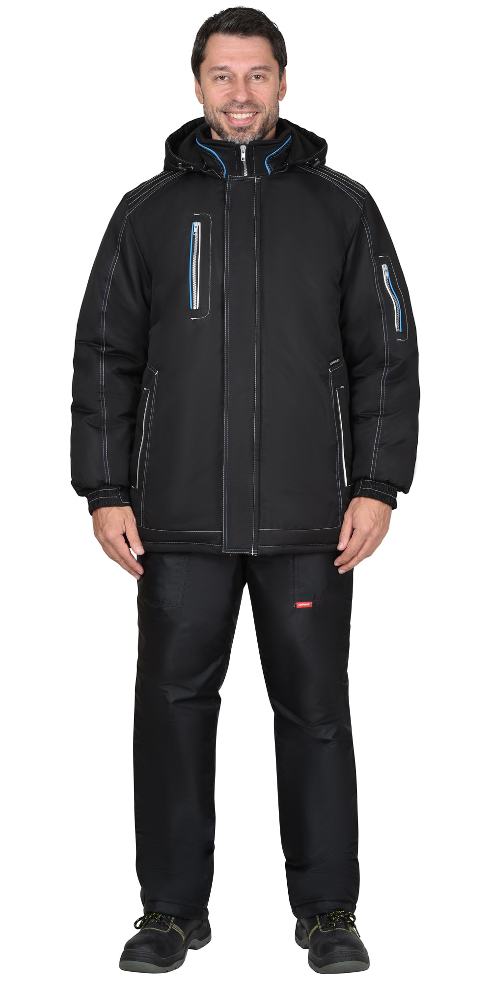 Куртка длинная, прямого силуэта, с притачной утеплённой подкладкой и съёмным капюшоном, с воротником-стойка, с центральной бортовой застёжкой на молнию, с ветрозащитной планкой застегивающейся на липучке и с подпланкой, с верхним и нижними прорезными карманами. Рукава втачные с манжетами, частично стянутыми на резинку, на левом рукаве карман на молнии, с внутренним карманом с молнией. Куртка с контрастными кантами по карманам и воротнику.