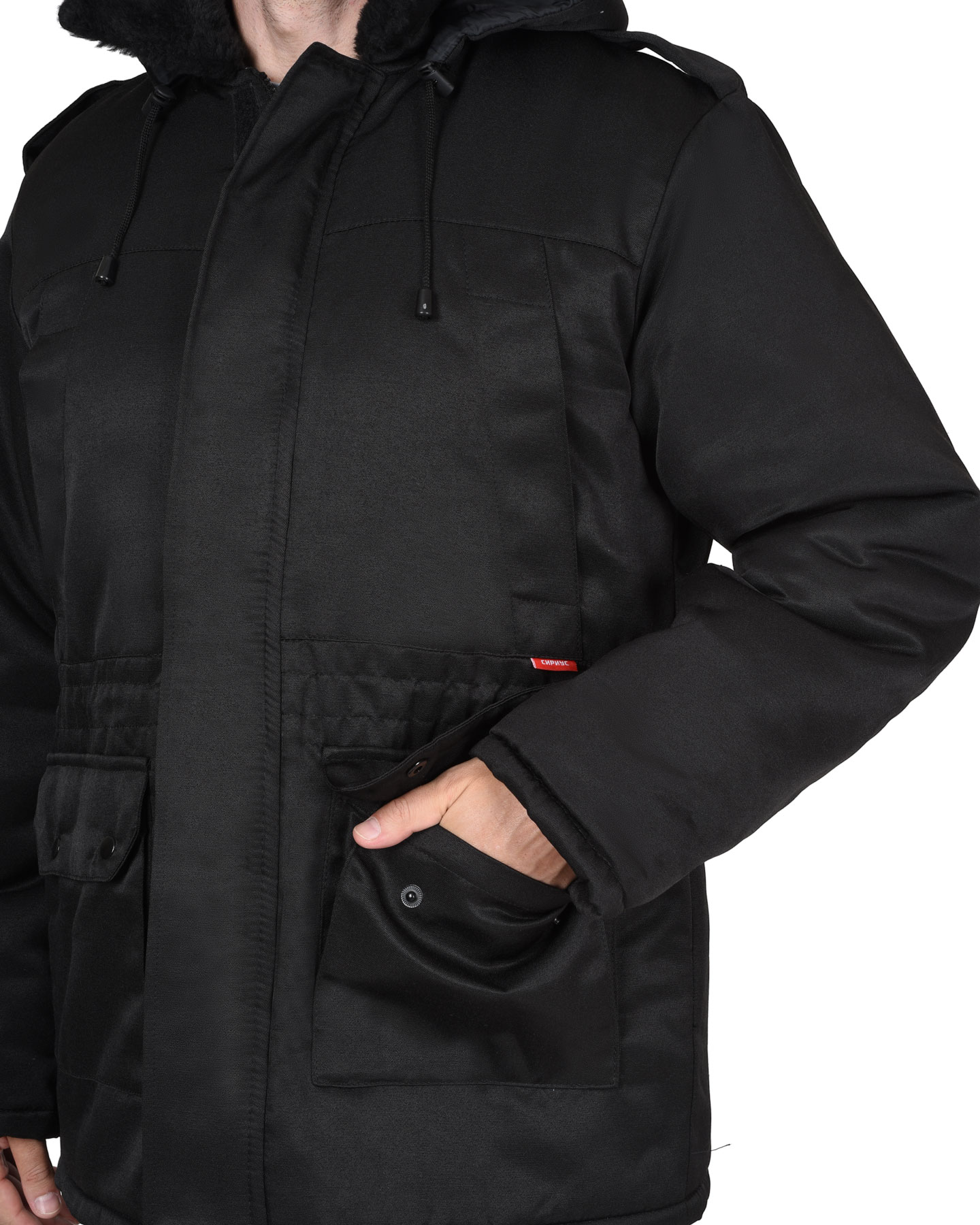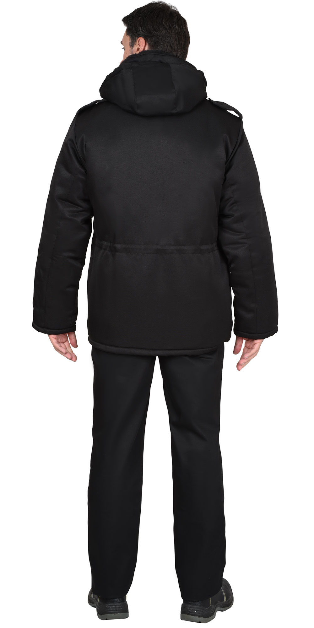 Куртка длинная утепленная прямого силуэта, с центральной застёжкой на тесьму - «молния» и внешним ветрозащитным клапаном на липучки. Изделие с отложным воротником, с пристёгивающимся капюшоном, верхними и нижними накладными карманами. Рукава втачные с внутренними трикотажными манжетами.