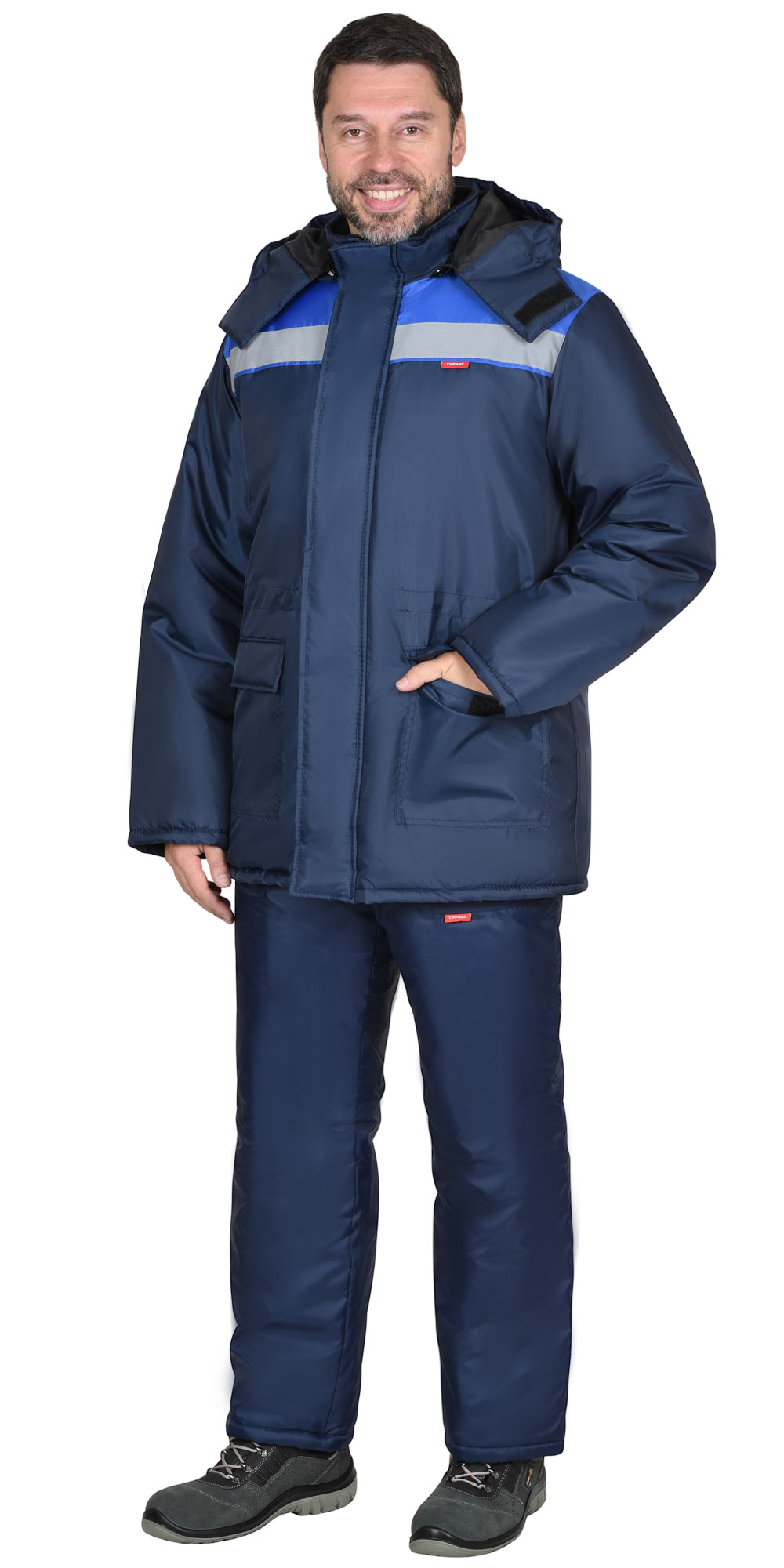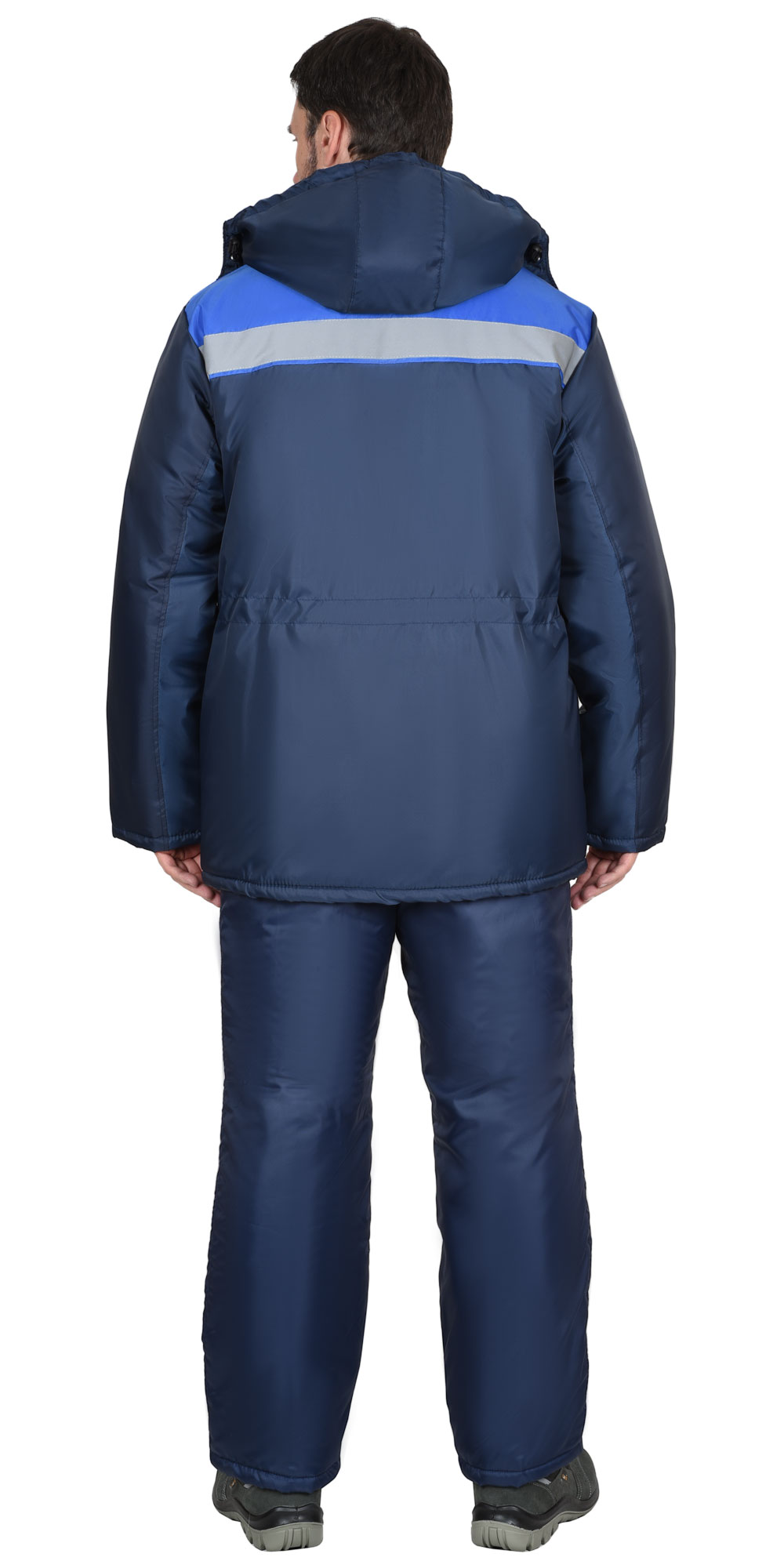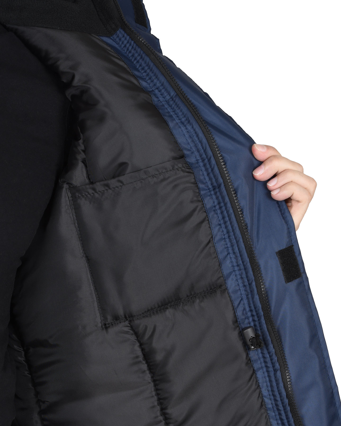 Куртка прямого силуэта с центральной застёжкой на двухзамковую тесьму - «молния» до верха; с внешней ветрозащитной планкой застегивающиеся на ленты «контакт» 3 шт. Воротник из ткани флис с внутренней стороны. Капюшон утепленный.