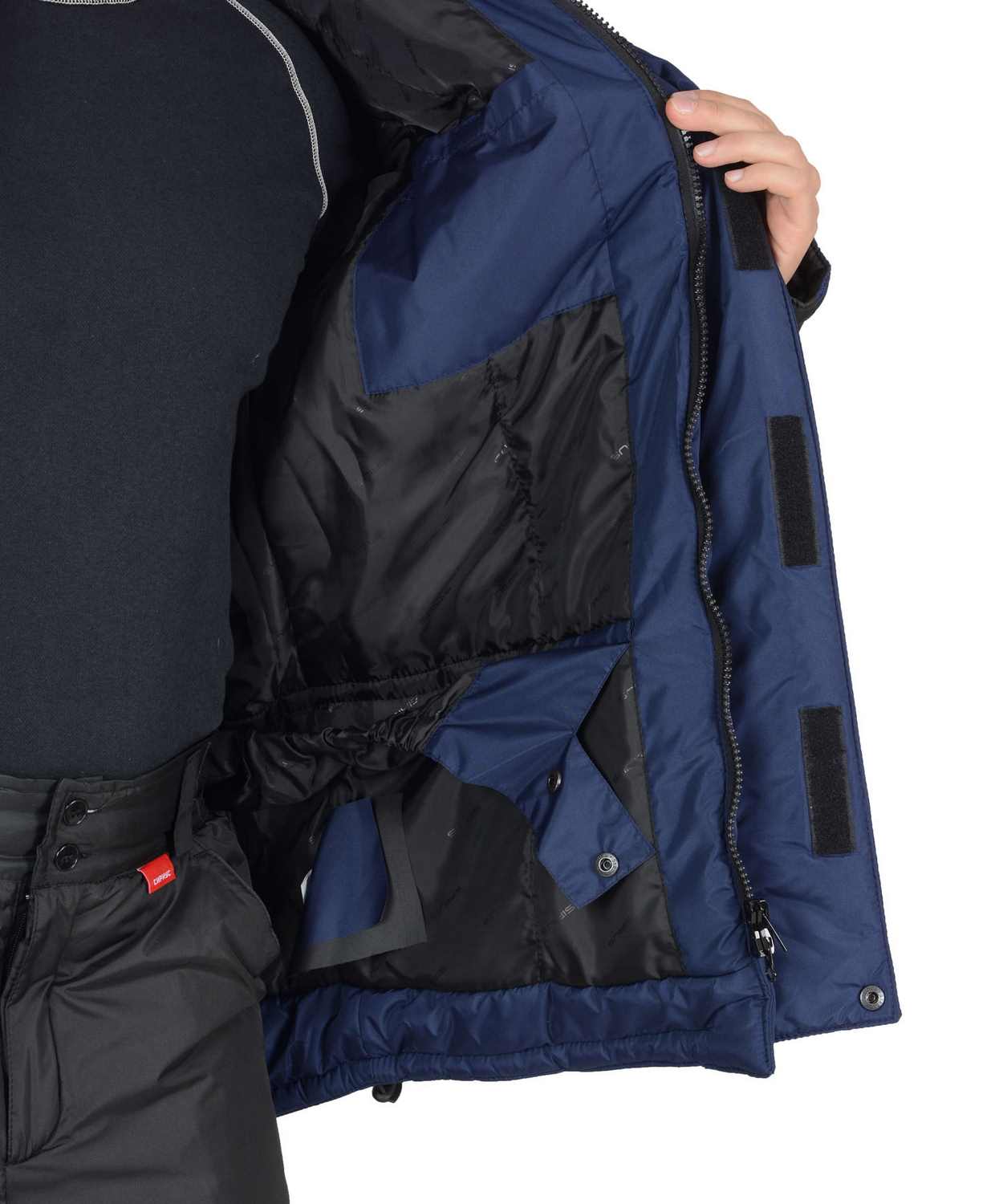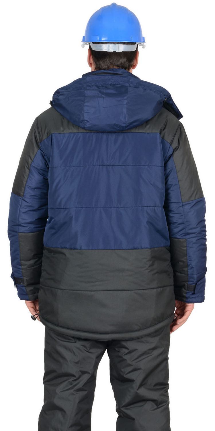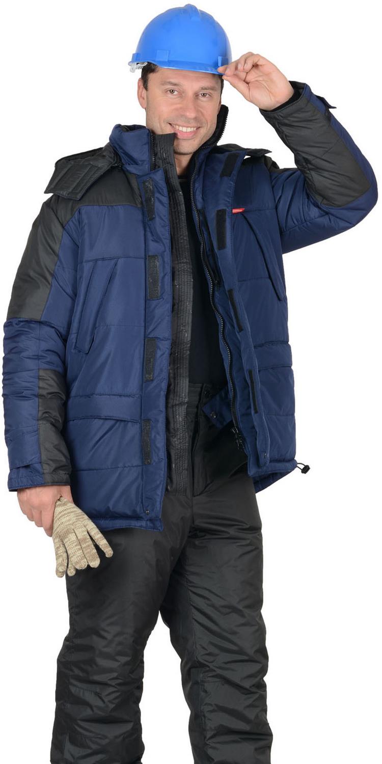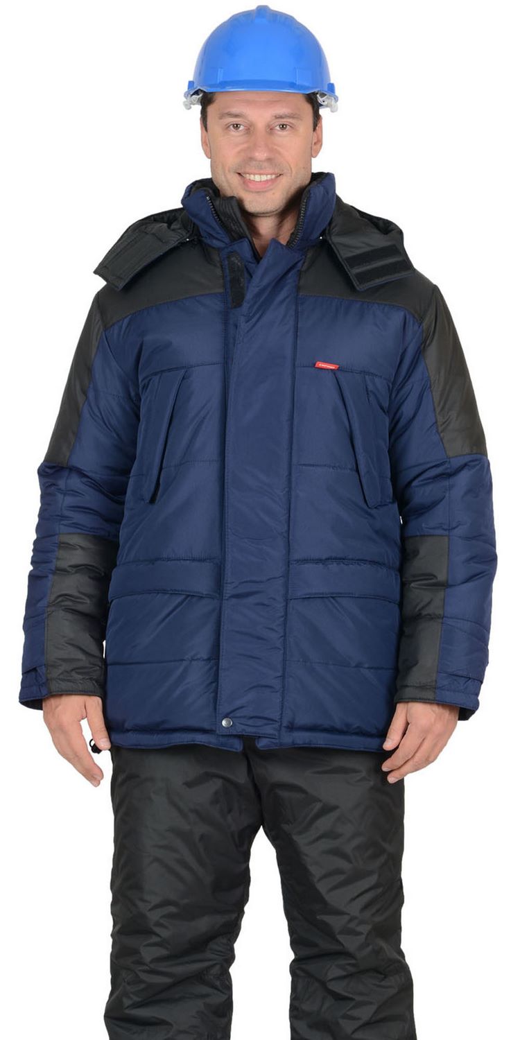 Куртка прямого силуэта; с горизонтальными строчками настрачивания слоя утеплителя на детали полочек, спинки, рукавов; воротник - «стойка»; с тесьмой «молния» по горловине, скрытой под планкой, для пристёгивания капюшона; с центральной бортовой застёжкой на двухзамковую тесьму «молния» и двумя внешними ветрозащитными клапанами, застёгивающимися на 4 текстильные застёжки «липучки» длиной 9,5см и одну кнопку, по низу планки; с внутренним ветрозащитным клапаном правой полочки (от верхнего края воротника до низа куртки), из ткани подкладка.