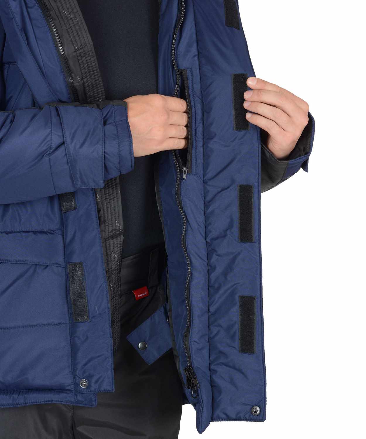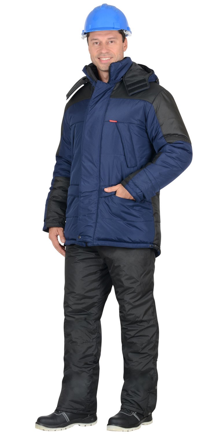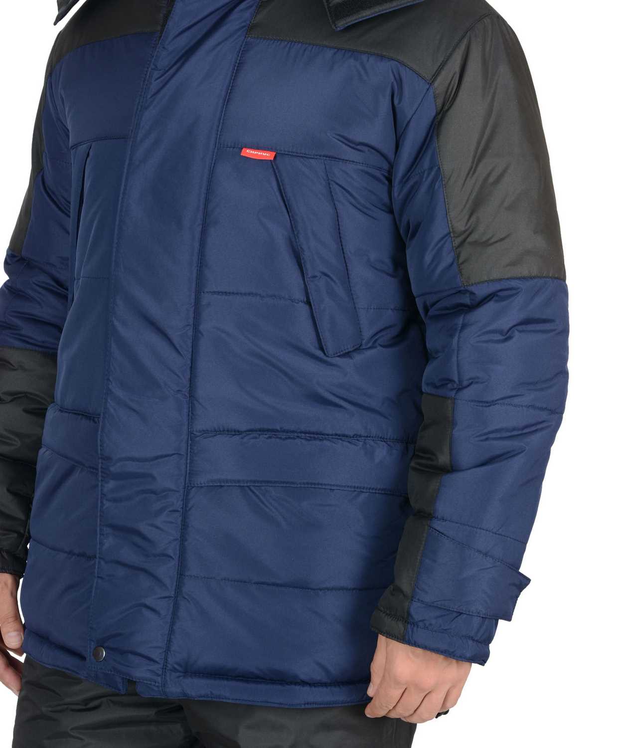 Куртка прямого силуэта; с горизонтальными строчками настрачивания слоя утеплителя на детали полочек, спинки, рукавов; воротник - «стойка»; с тесьмой «молния» по горловине, скрытой под планкой, для пристёгивания капюшона; с центральной бортовой застёжкой на двухзамковую тесьму «молния» и двумя внешними ветрозащитными клапанами, застёгивающимися на 4 текстильные застёжки «липучки» длиной 9,5см и одну кнопку, по низу планки; с внутренним ветрозащитным клапаном правой полочки (от верхнего края воротника до низа куртки), из ткани подкладка.