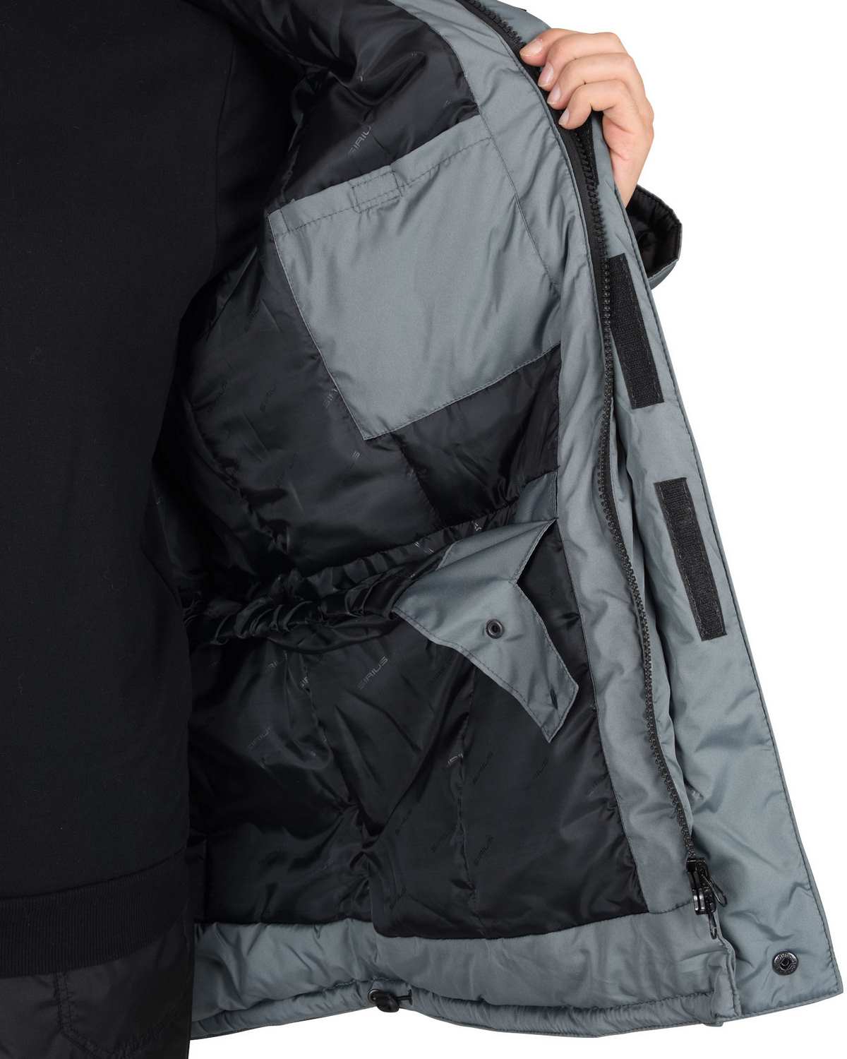 Куртка прямого силуэта; с горизонтальными строчками настрачивания слоя утеплителя на детали полочек, спинки, рукавов; воротник - «стойка»; с тесьмой «молния» по горловине, скрытой под планкой, для пристёгивания капюшона; с центральной бортовой застёжкой на двухзамковую тесьму «молния» и двумя внешними ветрозащитными клапанами, застёгивающимися на 4 текстильные застёжки «липучки» длиной 9,5см и одну кнопку, по низу планки; с внутренним ветрозащитным клапаном правой полочки (от верхнего края воротника до низа куртки), из ткани подкладка.