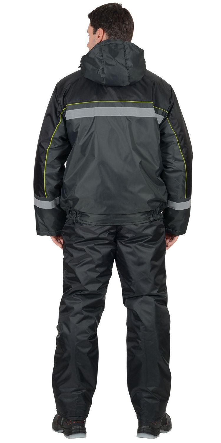 Куртка укороченная; прямого силуэта; с притачной утеплённой подкладкой, с притачным утеплённым капюшоном; с центральной застёжкой на двухзамковую тесьму - «молнию»; с внутренней малой ветрозащитной планкой правой полочки; внешней ветрозащитной планкой левой полочки ; с притачным поясом с эластичной лентой по боковым сторонам. Рукава с внутренними трикотажными напульсниками.По полочкам, спинке и рукавам куртки настрочена лента светоотражающая СОП шириной 50мм, для обозначения сигнальной видимости.