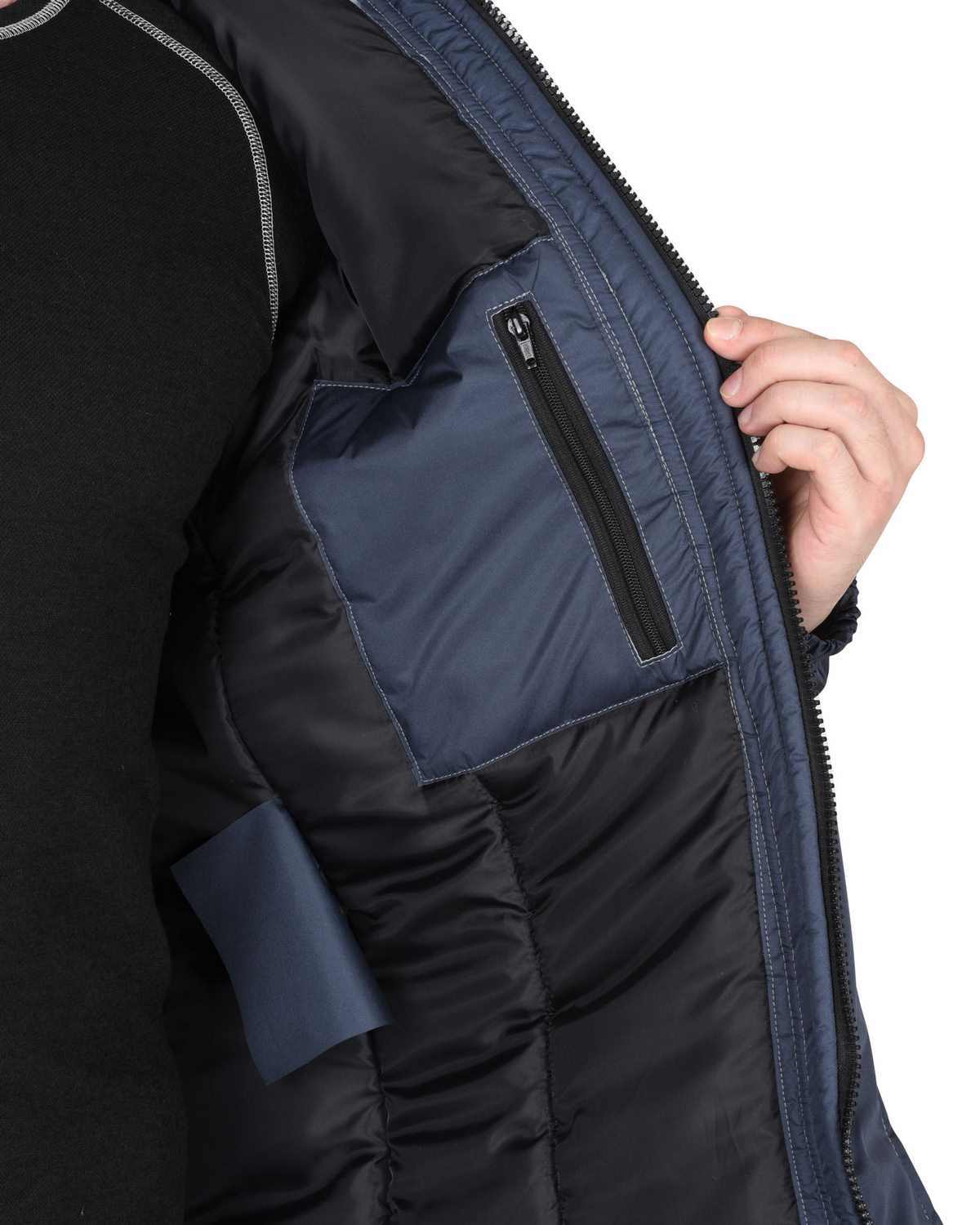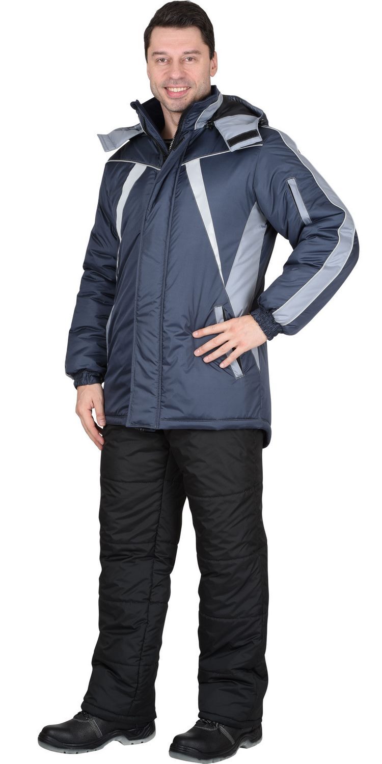 Куртка утепленная с центральной застежкой на тесьму - «молния», с карманами в листочку с втачными концами из декоративной резинки, с верхним прорезным карманом в рамку застегивающийся на тесьму - «молния», с втачным капюшоном, с притачным поясом из декоративной резинки. Рукава втачные с притачными манжетами, манжет с частичной стяжкой на резинку ткацкую. В куртке вшивается кант 3 мм для обозначения видимости.