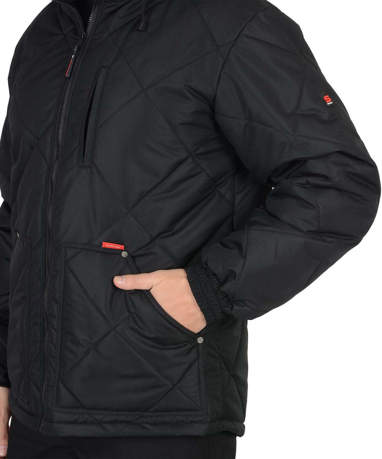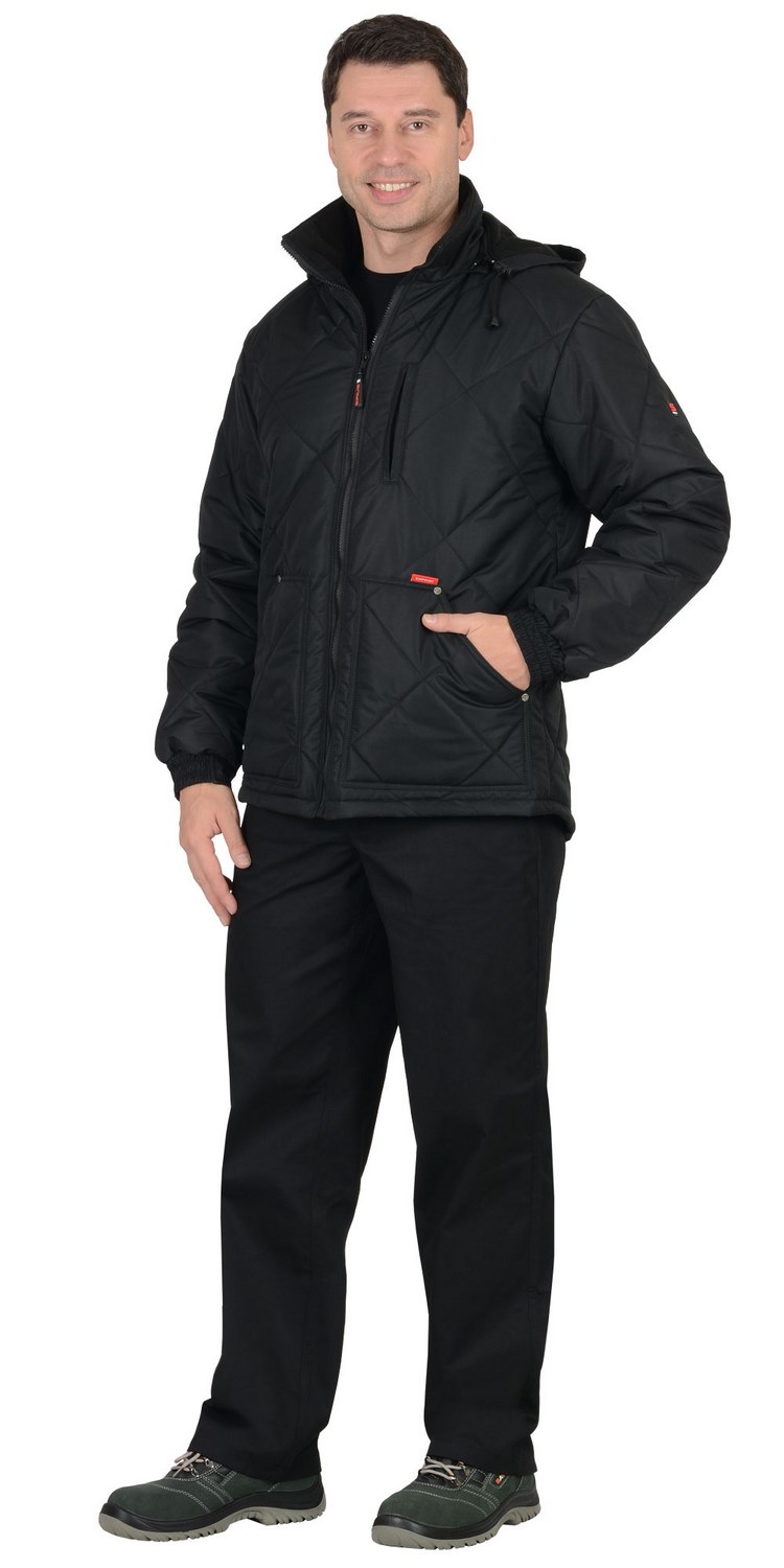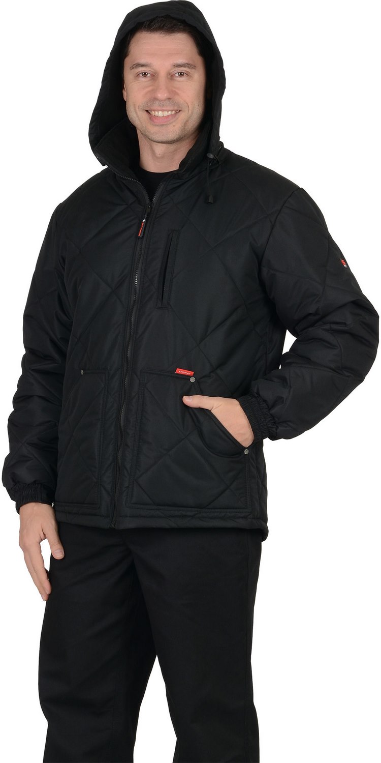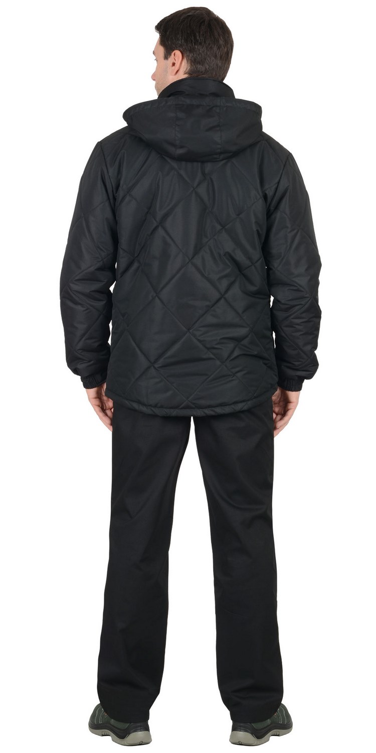 уртка утеплённая, длинная, на подкладке, со съёмным капюшоном, прямого силуэта, с центральной бортовой застёжкой на тесьму "молния", с воротником "стойка", с верхним прорезным и нижними накладными карманами, рукава втачные с притачными манжетами, манжеты частично стянуты эластичной лентой. Полочки, спинка, рукава и нижние карманы куртки выстёганы с утеплителем в виде ромбов.