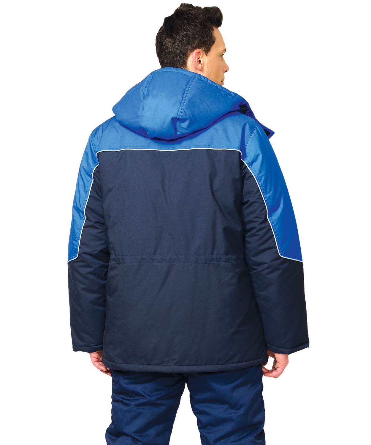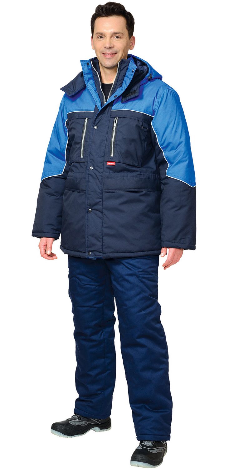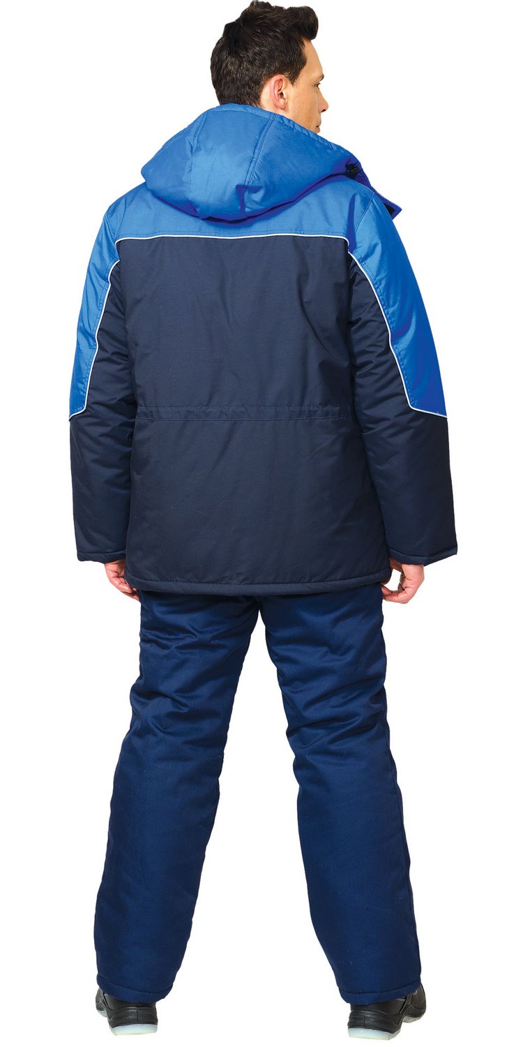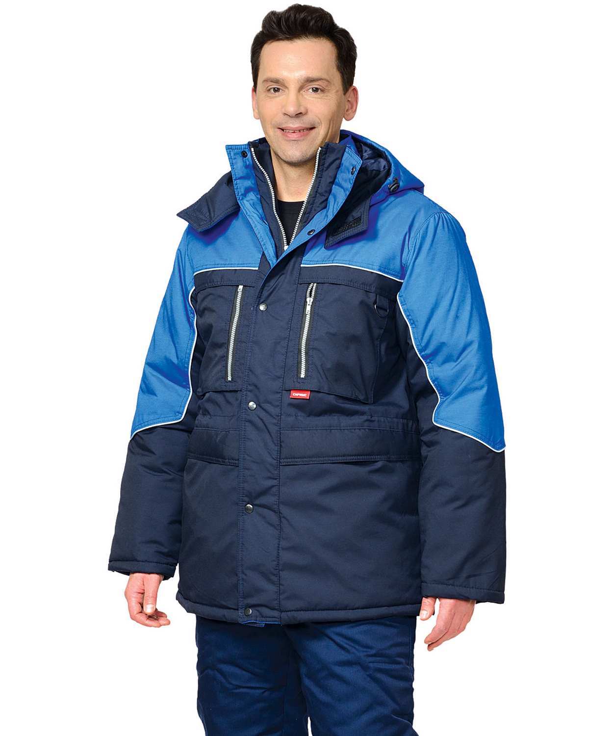 Куртка прямого силуэта, удлиненная, с центральной бортовой застежкой на однозамковую тесьму «молния», накрытую двумя внешними встречными ветрозащитными планками с застежкой (между собой) на кнопки; воротник – стойка с планкой для пристегивания капюшона; с верхними накладными карманами с застёжкой на молнию и с нижними прорезными карманами «листочка» с клапанами. Ширина куртки по талии регулируется при помощи кулиски.