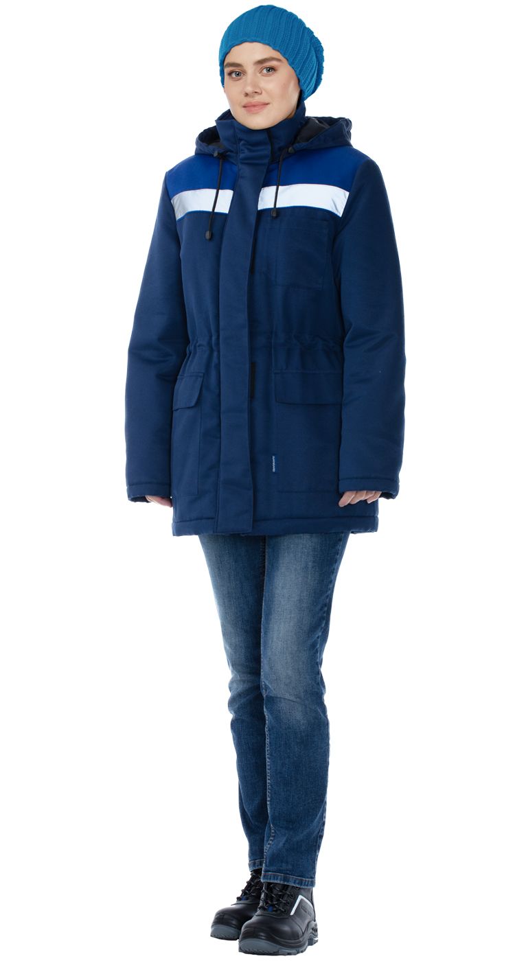 Верхние кокетки переда и спинки выполнены из ткани контрастного оттенка. По низу кокеток расположены широкие световозвращающие полосы.