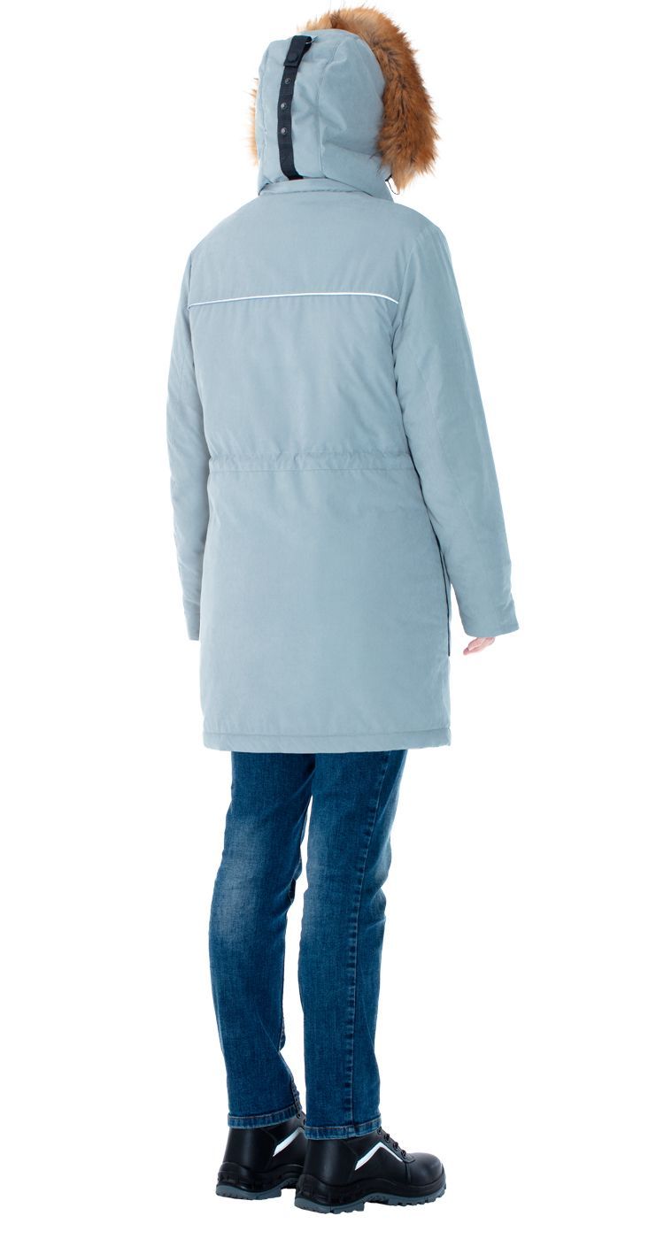 Куртка удлиненная, с центральной застежкой на двухзамковую молнию под ветрозащитной планкой на липучках.