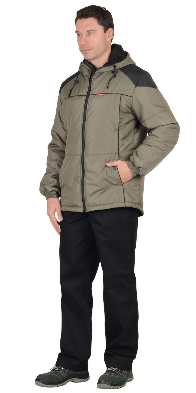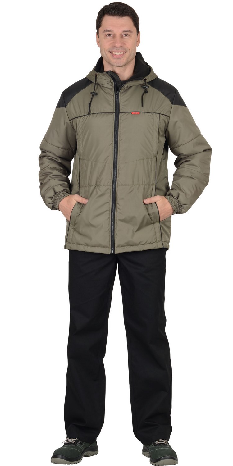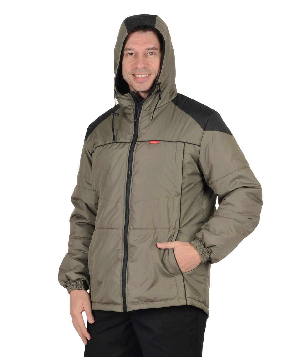 куртка "Спринтер" мужская, оливковая с чернымКуртка, утеплённая прямого силуэта, с втачным капюшоном, центральной бортовой застёжкой на тесьму - "молния", с под планкой, с верхними прорезными карманами на "молнии" и нижними карманами в рельефах, с карманом на тесьму - "молния" на подкладке с левой стороны. Рукава втачные, с притачной манжетой частично стянутые на ткацкую резинку.