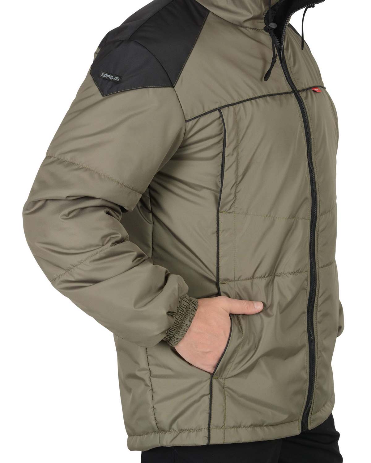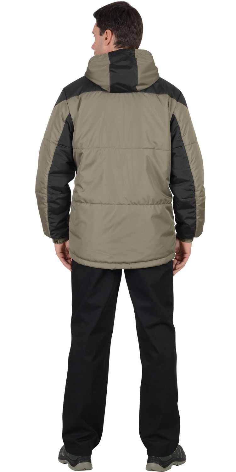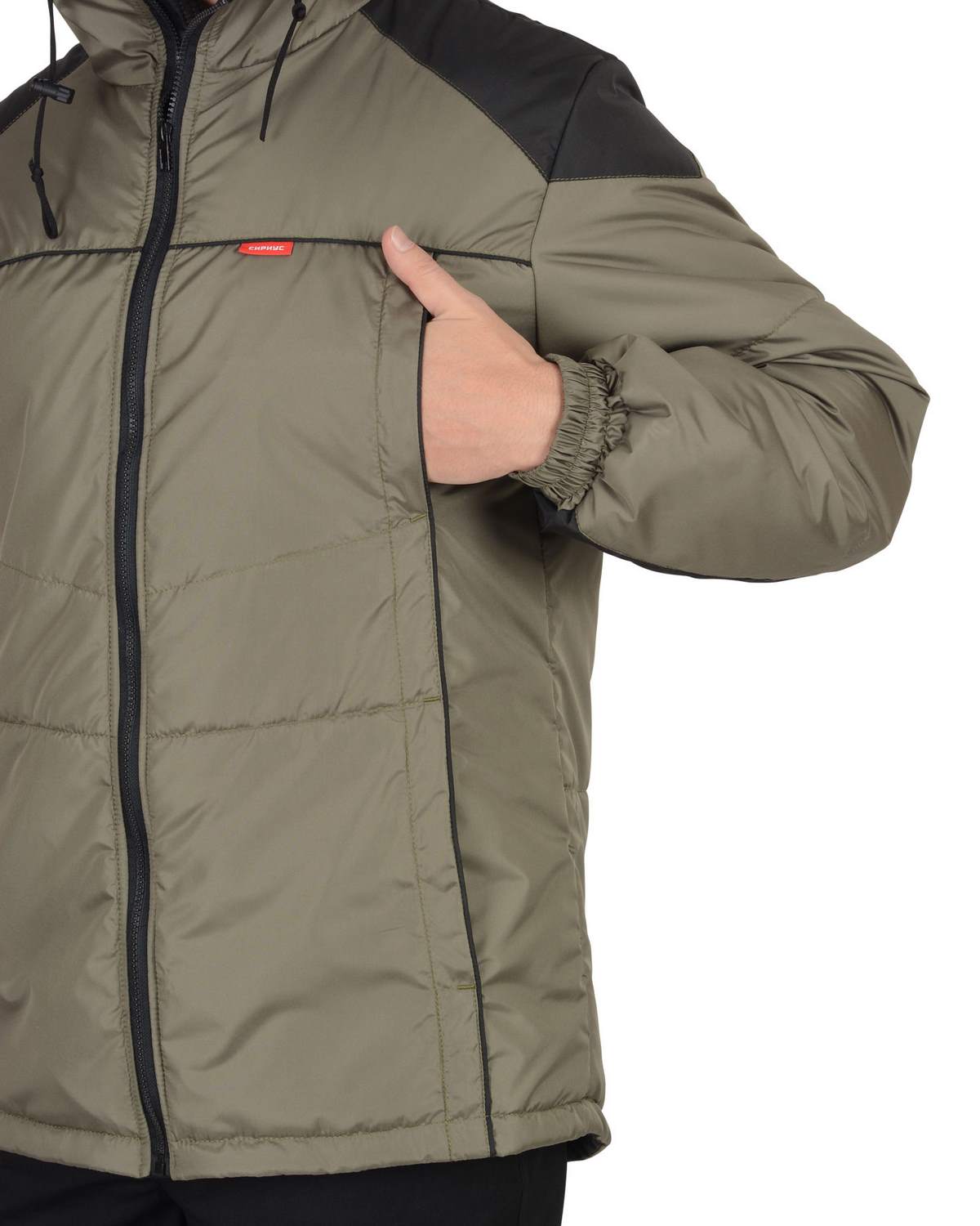 куртка "Спринтер" мужская, оливковая с чернымКуртка, утеплённая прямого силуэта, с втачным капюшоном, центральной бортовой застёжкой на тесьму - "молния", с под планкой, с верхними прорезными карманами на "молнии" и нижними карманами в рельефах, с карманом на тесьму - "молния" на подкладке с левой стороны. Рукава втачные, с притачной манжетой частично стянутые на ткацкую резинку.