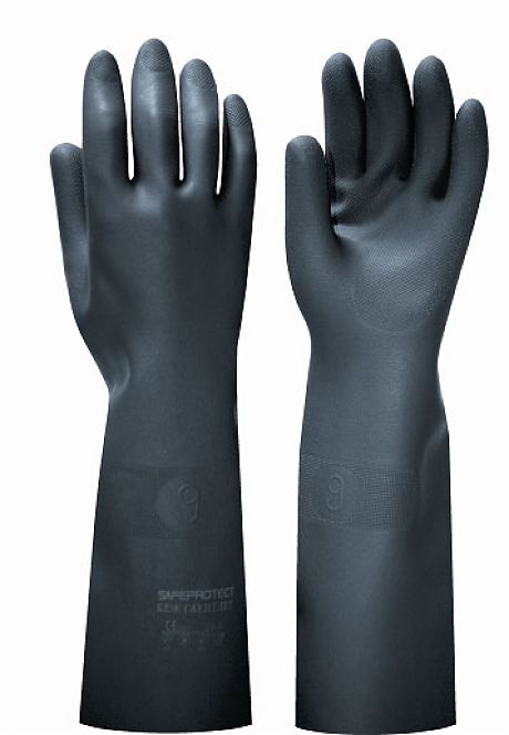 Предлагаемое изделие из природного каучука большой толщины (0,8 мм) по своей форме очень близки к крагам. При длине 450 мм перчатки полностью защищают предплечье человека среднего роста. Их материал гарантирует абсолютную защиту от агрессивных веществ, включая концентрированные кислоты, 40-процентные щелочные растворы, нефтепродукты, растворители и прочее. Он также устойчив к механическому износу и долговечен. Ладонная часть имеет сотовую насечку, которая обеспечивает прочный захват.