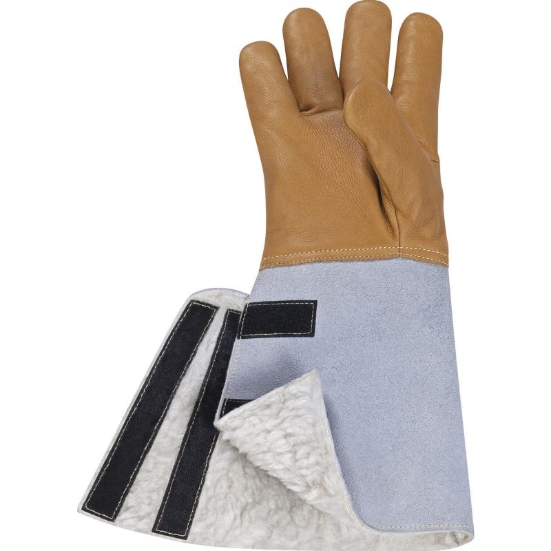Перчатки утепленные комбинированные. Материал тыльной и ладонной частей - водоотталкивающая воловья кожа с алюминизированной полиэстеровой вставкой, устойчивой к жидкому азоту. Манжета (20 см) - кожевенный спилок, ширина манжеты по всей длине регулируется с помощью контактной ленты. Внутренняя часть (утеплитель) – шерстяная подкладка. Перчатки имеют высокие защитные свойства от всех видов механического воздействия (истирания, порезов, проколов и порезов). Устойчивость к маслу, жиру и производным углеводородов.