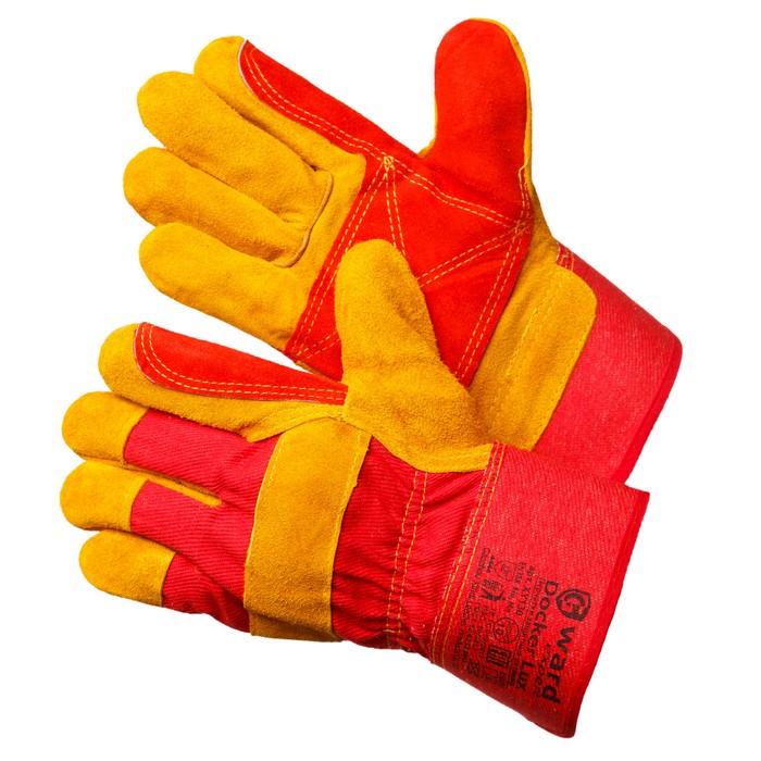 Спилковые комбинированные перчатки. Сшиты из высококачественного спилка КРС оранжевого цвета и еще более плотной ткани красного цвета. Дополнительные спилковые накладки из спилка красного цвета на ладони, а так же большом и указательных пальцах расширяют возможности использования данных перчаток для работ с более высокой истирательной и разрывной нагрузкой. Перчатка усилена защитным наладонником из спилка красного цвета на ладони, а так же большом и указательных пальцах. Пришиваются к перчатке двойными усиленными швами.
