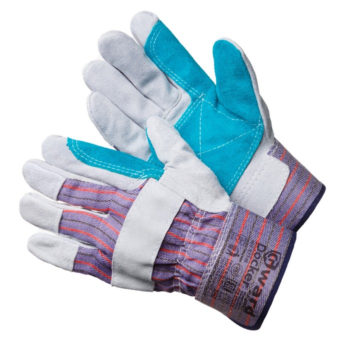 Спилковые комбинированные перчатки. Сшиты из спилка КРС серого цвета и плотной ткани фиолетово-красной цветовой гаммы, прошиты прочными нитями. Дополнительные накладки в районе ногтевых пластин и костяшек тыльной стороны ладони защищают эти места от травм. Перчатка усилена защитным наладонником из спилка зеленого цвета на ладони, а так же большом и указательных пальцах. Пришиваются к перчатке двойными усиленными швами.