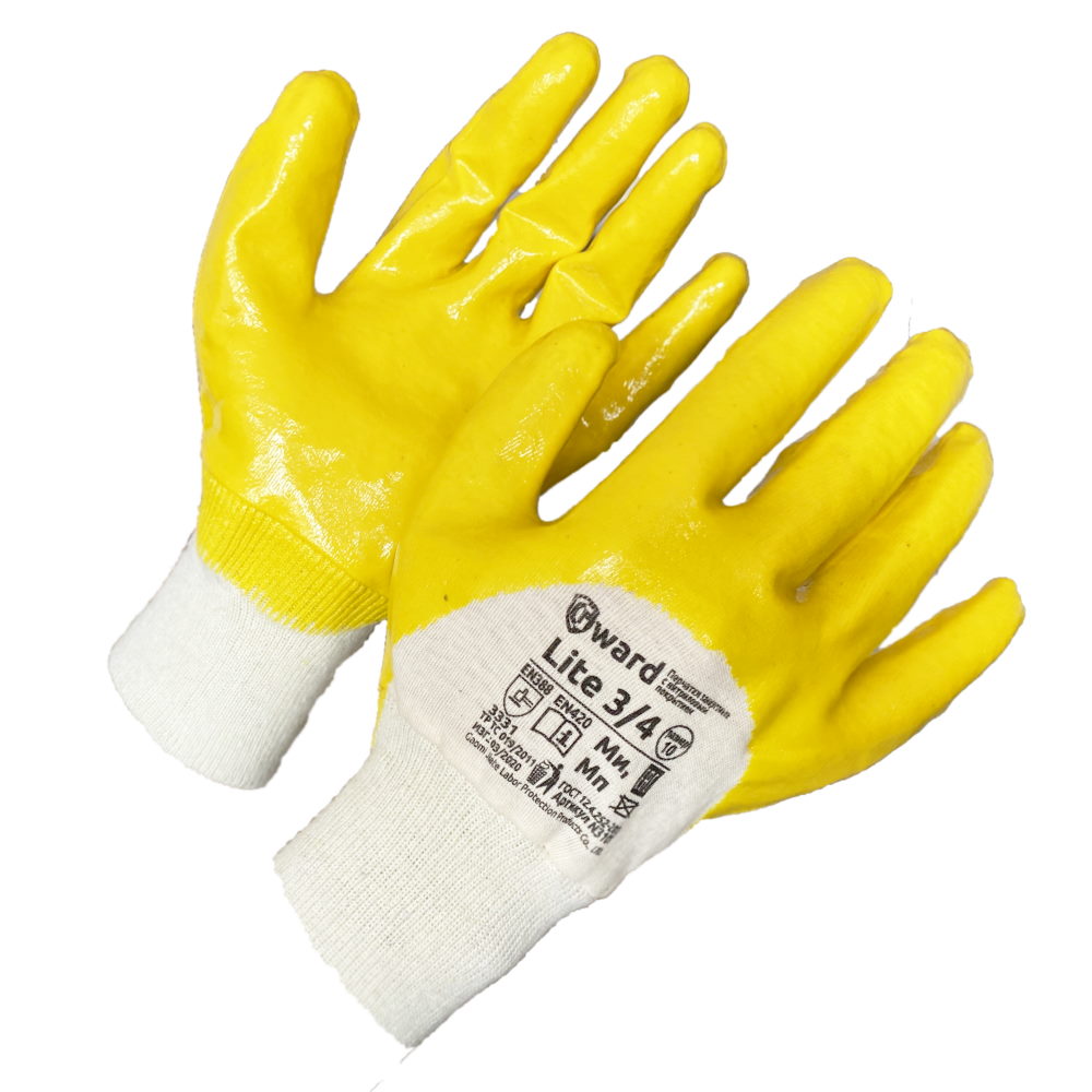 Трикотажные перчатки на плотной основе интерлок, покрытые в один слой жёлтым нитрилом премиум-качества на три четверти - закрыты пальцы, ладонь и тыльная сторона ладони по костяшки.