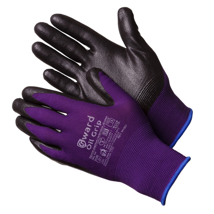 Нейлоновые перчатки фиолетового цвета, покрытые вспененным (микропористым) нитрилом черного цвета. Предназначены для работы со скользкими предметами. Бесшовная основа 13го класса вязки прекрасно вентилируется и не оставляет ворсинок. Универсальны, применяются для любых механических работ. Двойной оверлок с латексным кольцом обеспечивает превосходную фиксацию перчатки на запястье.