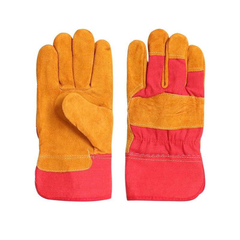 Перчатки комбинирванные, плотная смесовая ткань красного цвета со спилком сорта А желтого цвета, усиленная жесткая крага.