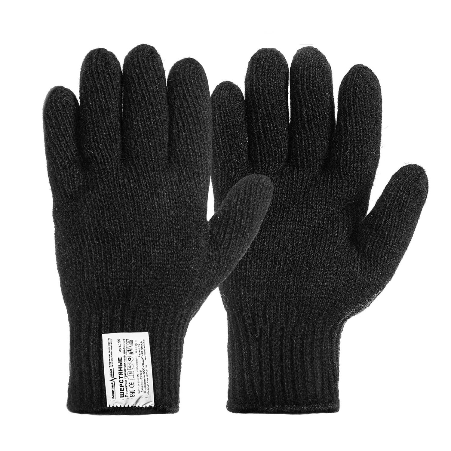 Перчатки шерстяные двухслойные 70% шерсть + 30% акрил, 7,5 класс вязки, черного цвета с двойным оверлоком. Перчатки предназначены для выполнения работ не связанных с большими механическими нагрузками на открытом воздухе при отрицательных температурах. Климатический пояс: Ⅰ, Ⅱ, Ⅲ и «особый». Упакованы в мешки по 80 пар.