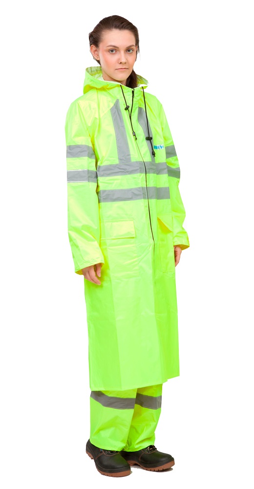 Влагозащитный плащ повышенной видимости с капюшоном и двумя карманами с клапанами.