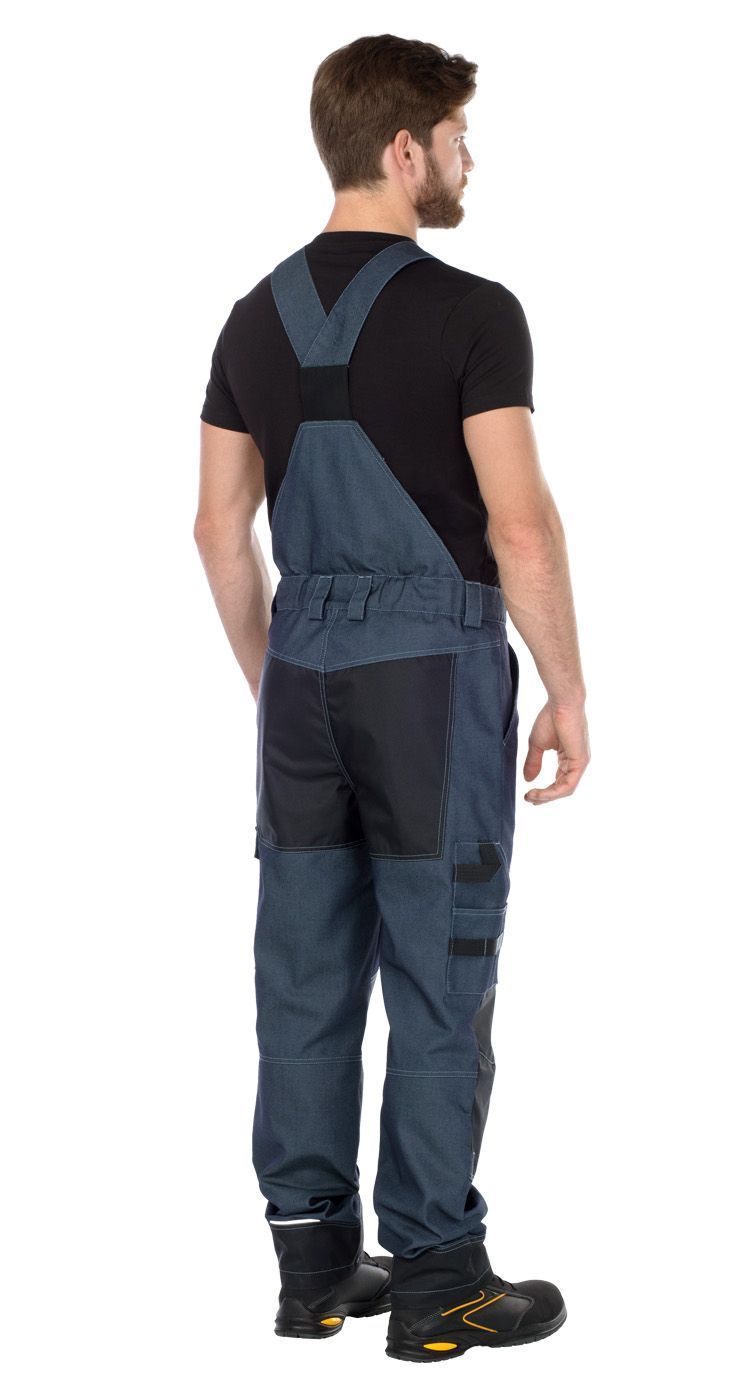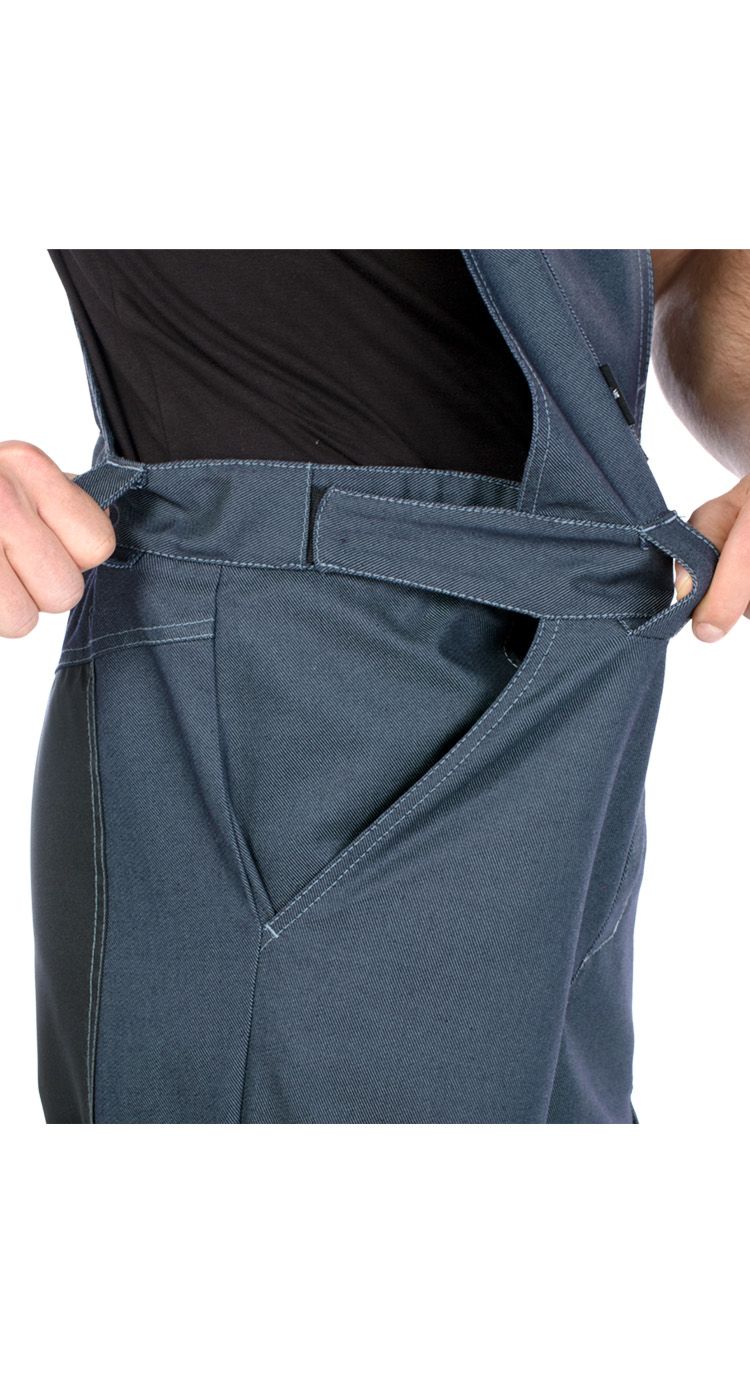 Пояс со шлевками для ремня. Эффективная эластичная регулировка объема по талии. Верхние карманы с наклонным входом. Боковые накладные карманы в области середины бедер: слева карман-полупортфель с клапаном, справа для инструментов с отделом для ручки, а также со стропой и петлей для молотка.