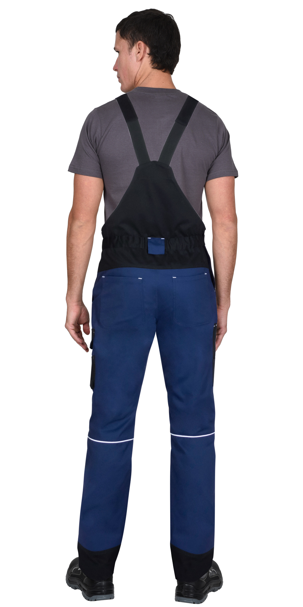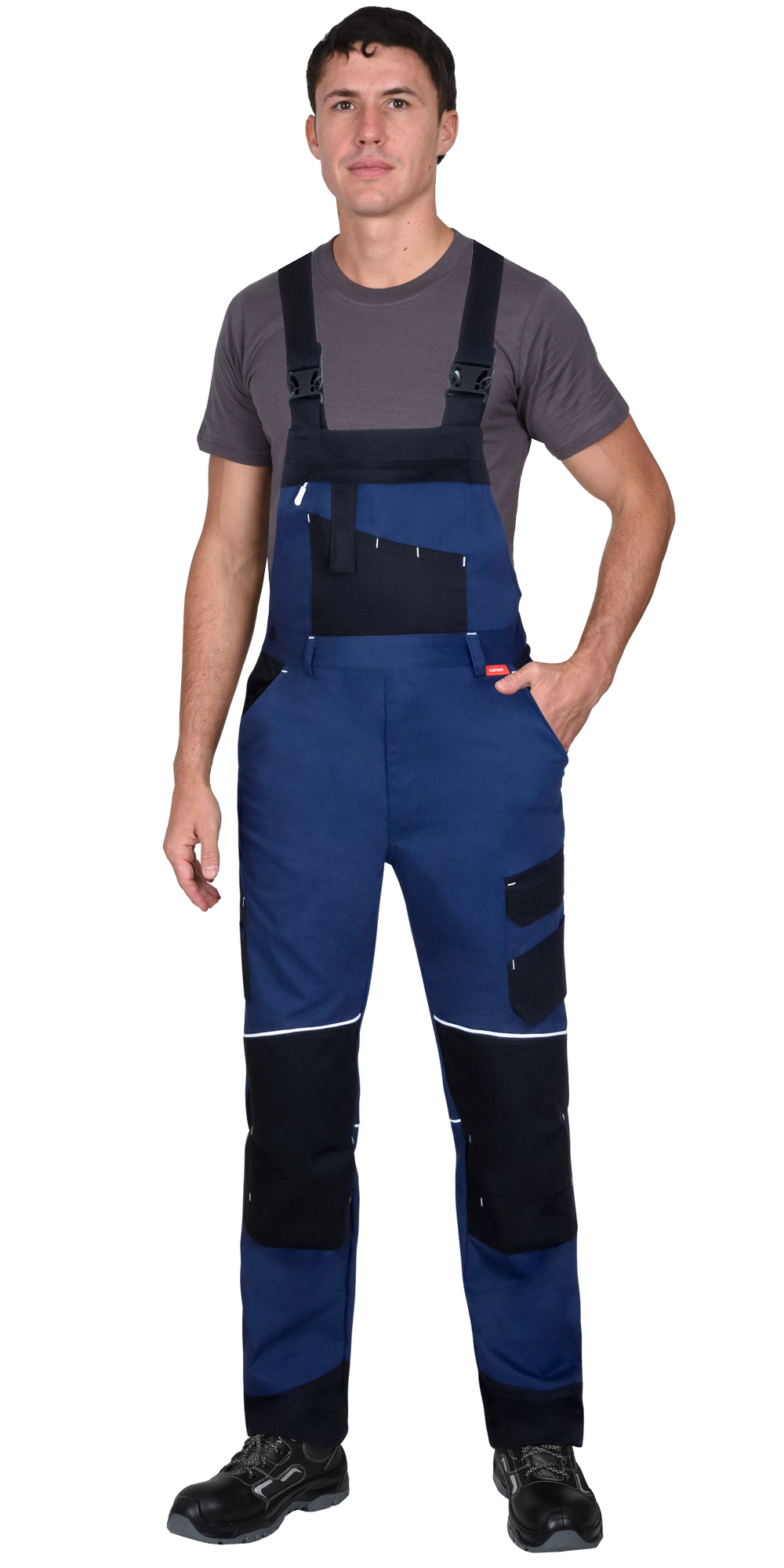Полукомбинезон со световозвращающим кантом, прямого кроя, с отрезным нагрудником и отрезной спинкой, с застежкой спереди - гульфик с тесьмой «молния» и с застежкой в правом боковом шве на две кнопки, с объёмными наколенниками, различными многофункциональными карманами, регулируемыми бретелями, эластичной тесьмой по линии талии сзади.