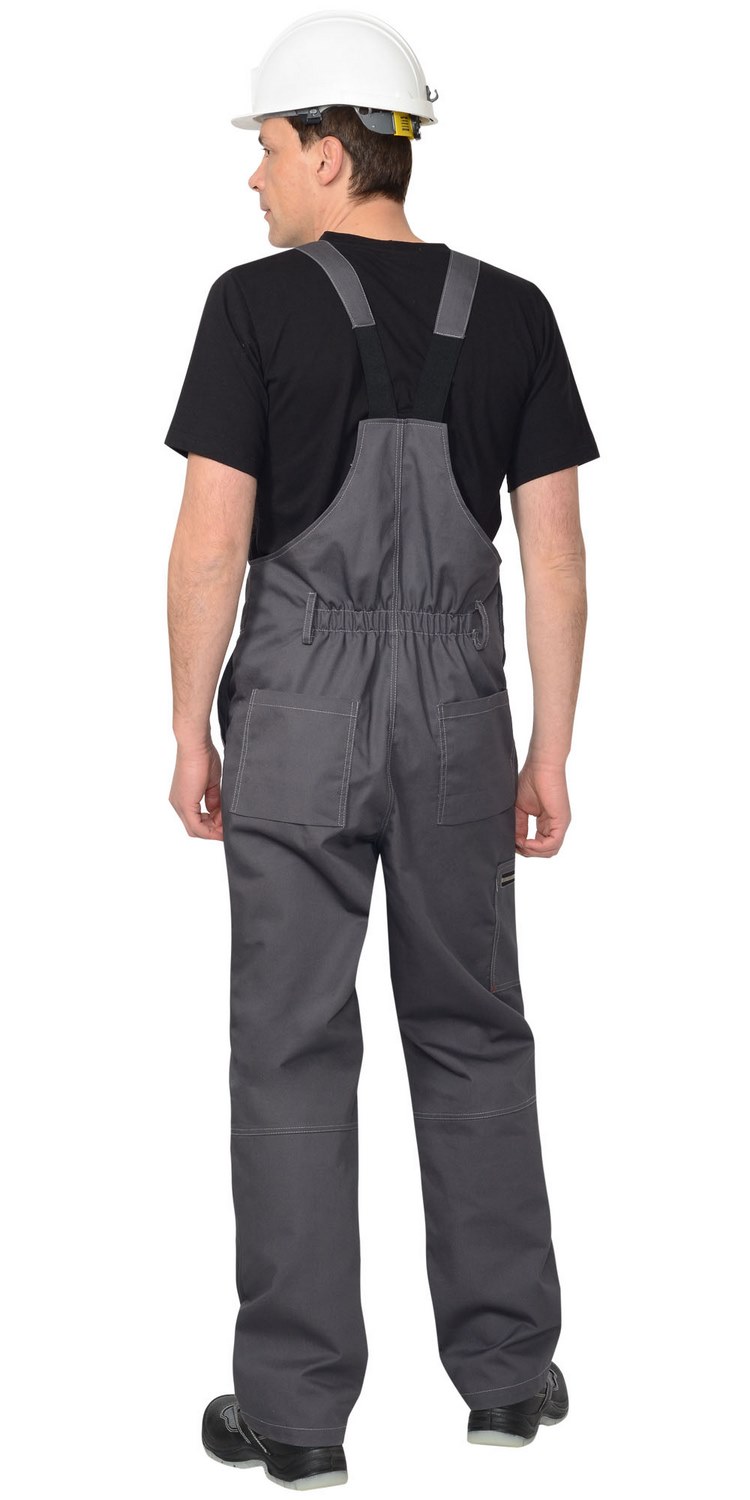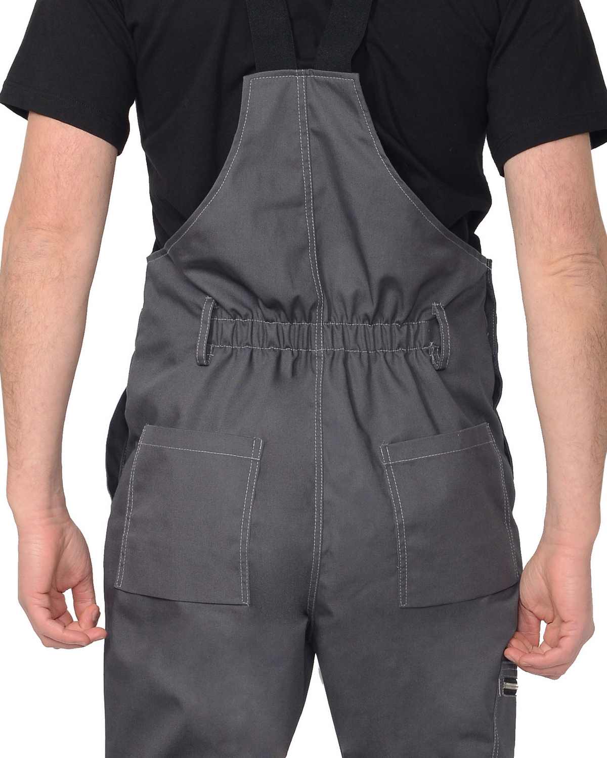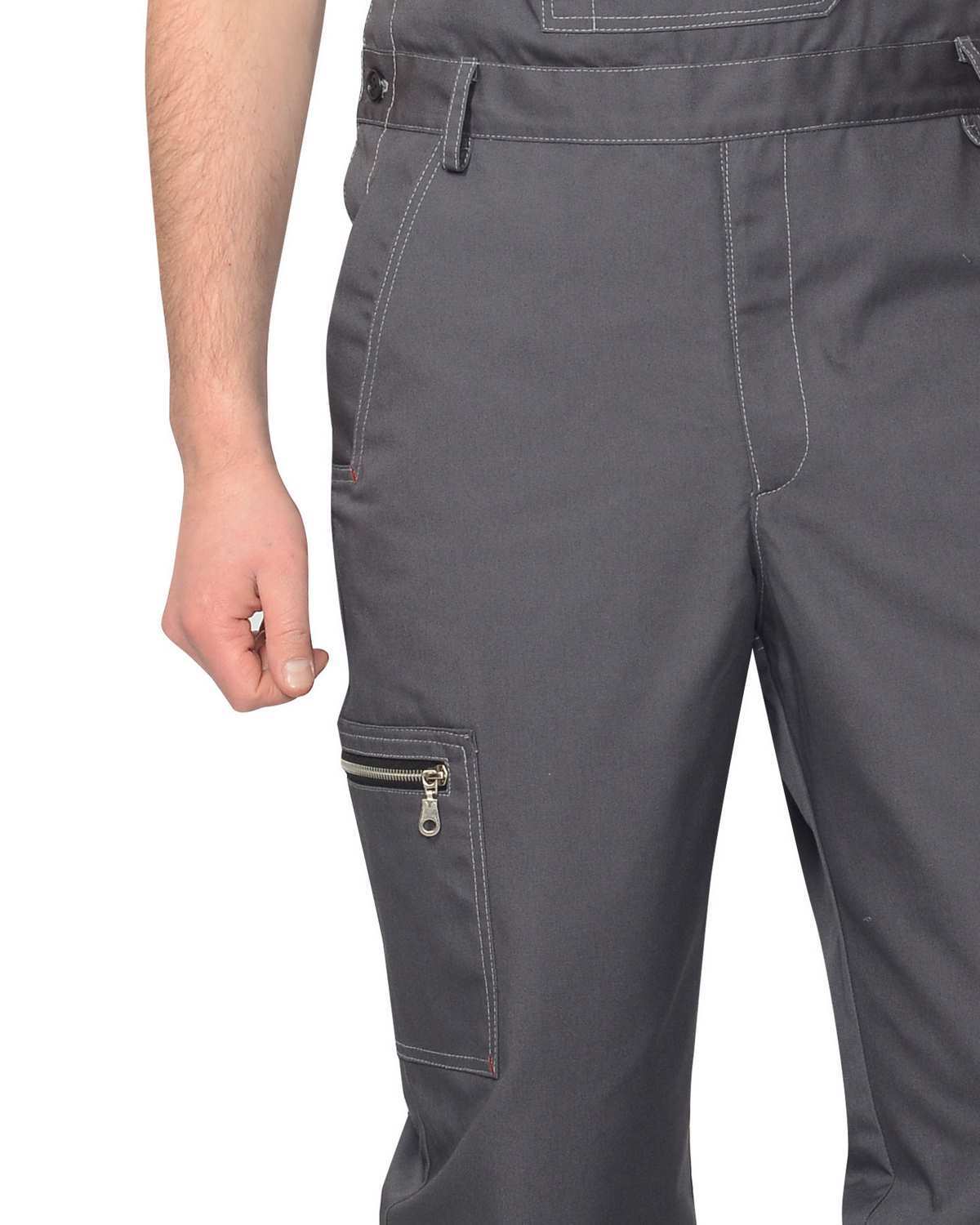 Полукомбинезон с застежкой гульфика на тесьму - «молния», с боковой застежкой на 3 петли и пуговицы. Передние половинки с внутренними боковыми карманами с «планками» с наклонным входом, нижние углы карманов закреплены закрепками отделочными нитками и хольнитенами. На нагруднике выполнен фигурный накладной карман, с клапаном застегивающийся на «липучку», на кармане сделано разделение под ручку. Задние половинки полукомбинезона с цельнокроеной спинкой с резинкой по спинке для лучшего прилегания, с двумя накладными карманами с нижним объемом. На правом боковом шве полукомбинезона настрочен карман, с горизонтальным входом в карман, застёгивающийся на металлическую тесьму «молнию».