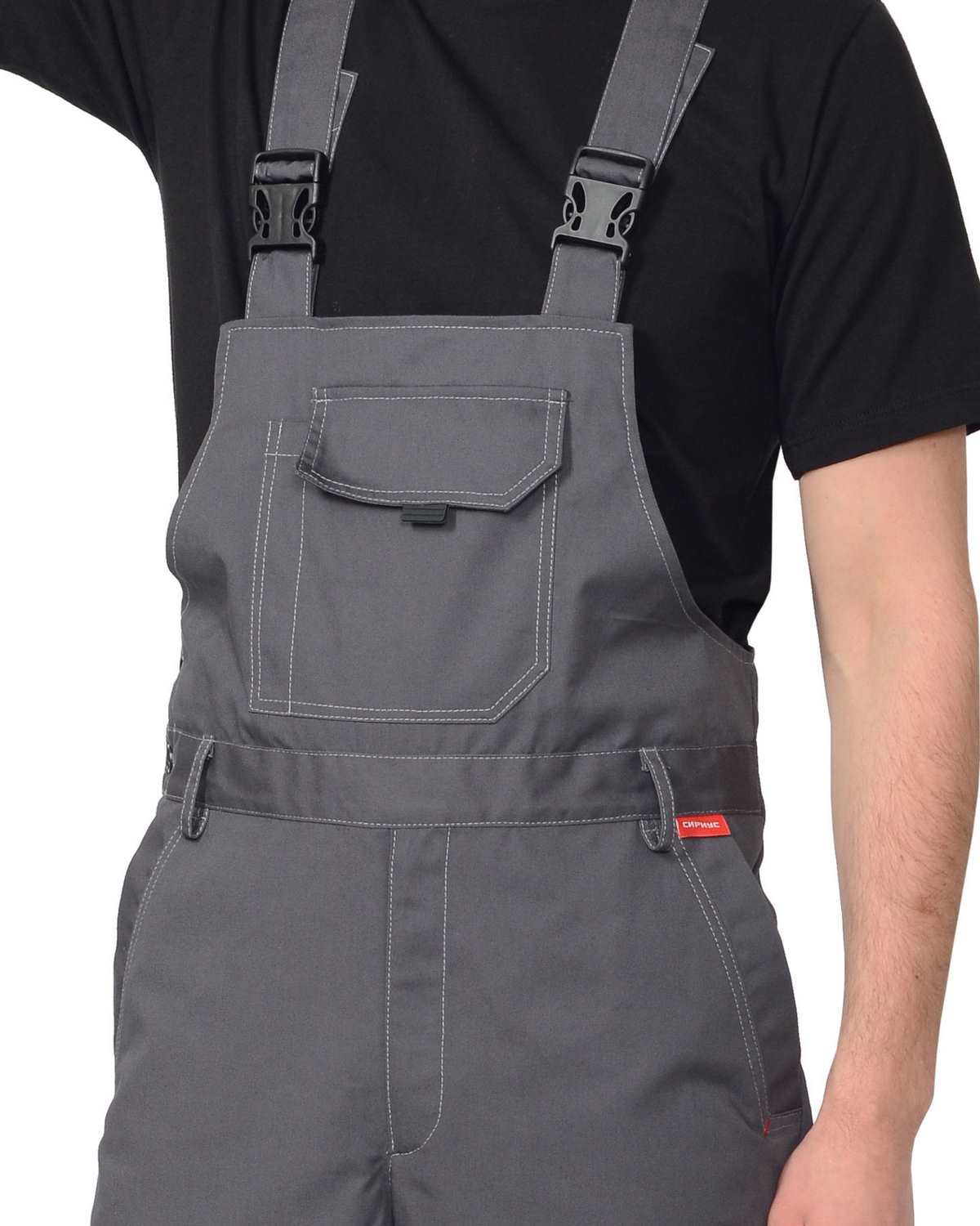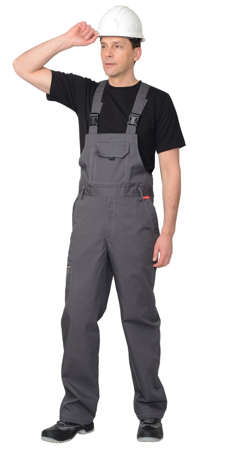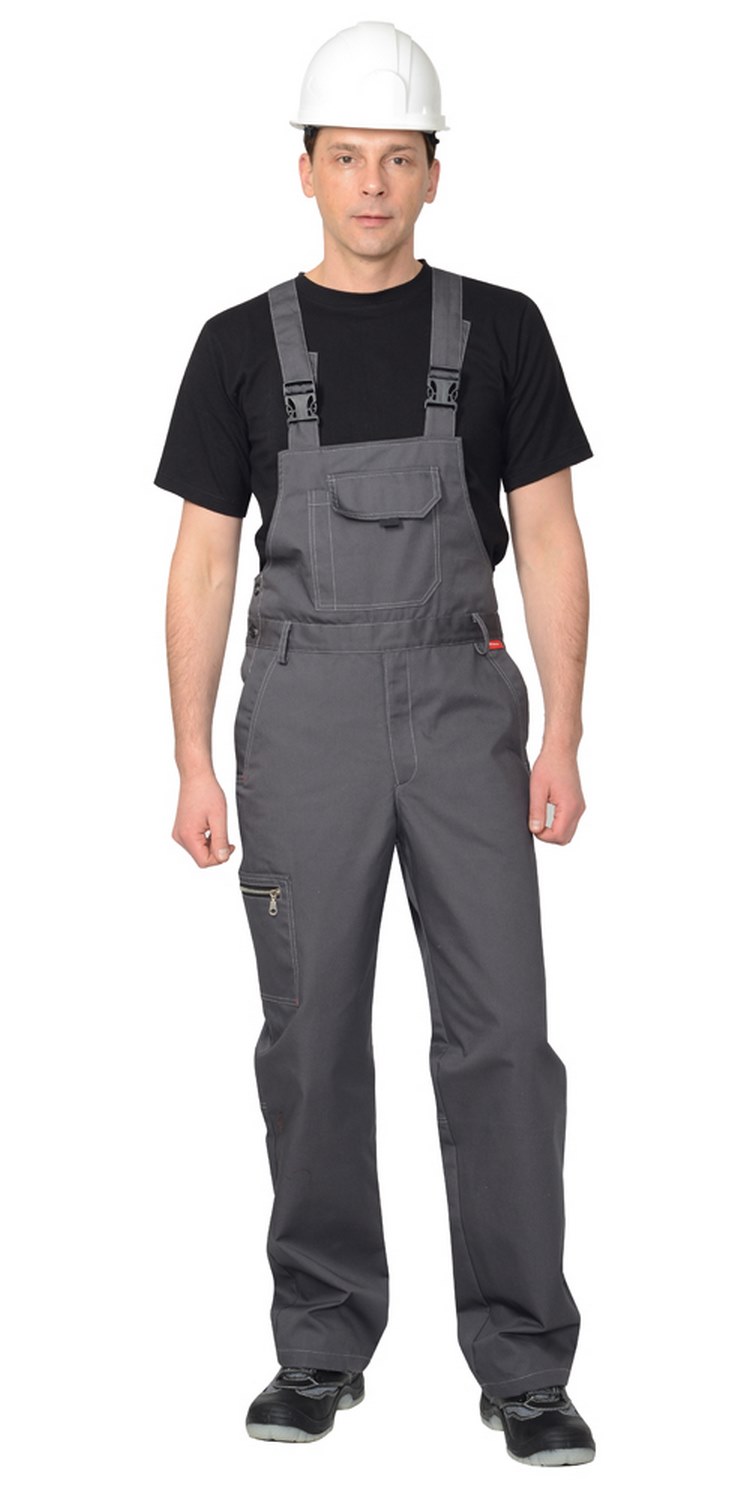 Полукомбинезон с застежкой гульфика на тесьму - «молния», с боковой застежкой на 3 петли и пуговицы. Передние половинки с внутренними боковыми карманами с «планками» с наклонным входом, нижние углы карманов закреплены закрепками отделочными нитками и хольнитенами. На нагруднике выполнен фигурный накладной карман, с клапаном застегивающийся на «липучку», на кармане сделано разделение под ручку. Задние половинки полукомбинезона с цельнокроеной спинкой с резинкой по спинке для лучшего прилегания, с двумя накладными карманами с нижним объемом. На правом боковом шве полукомбинезона настрочен карман, с горизонтальным входом в карман, застёгивающийся на металлическую тесьму «молнию».