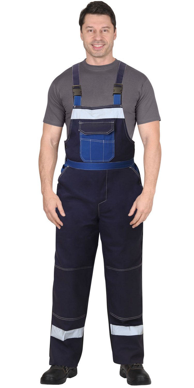 Полукомбинезон прямого покроя; с притачным нагрудником; с наколенниками; с накладным комбинированным фигурным карманом с фигурным клапаном на нагруднике; с боковыми внутренними карманами; с накладным карманом на правой задней половинке п/к; с карманами для инструмента.