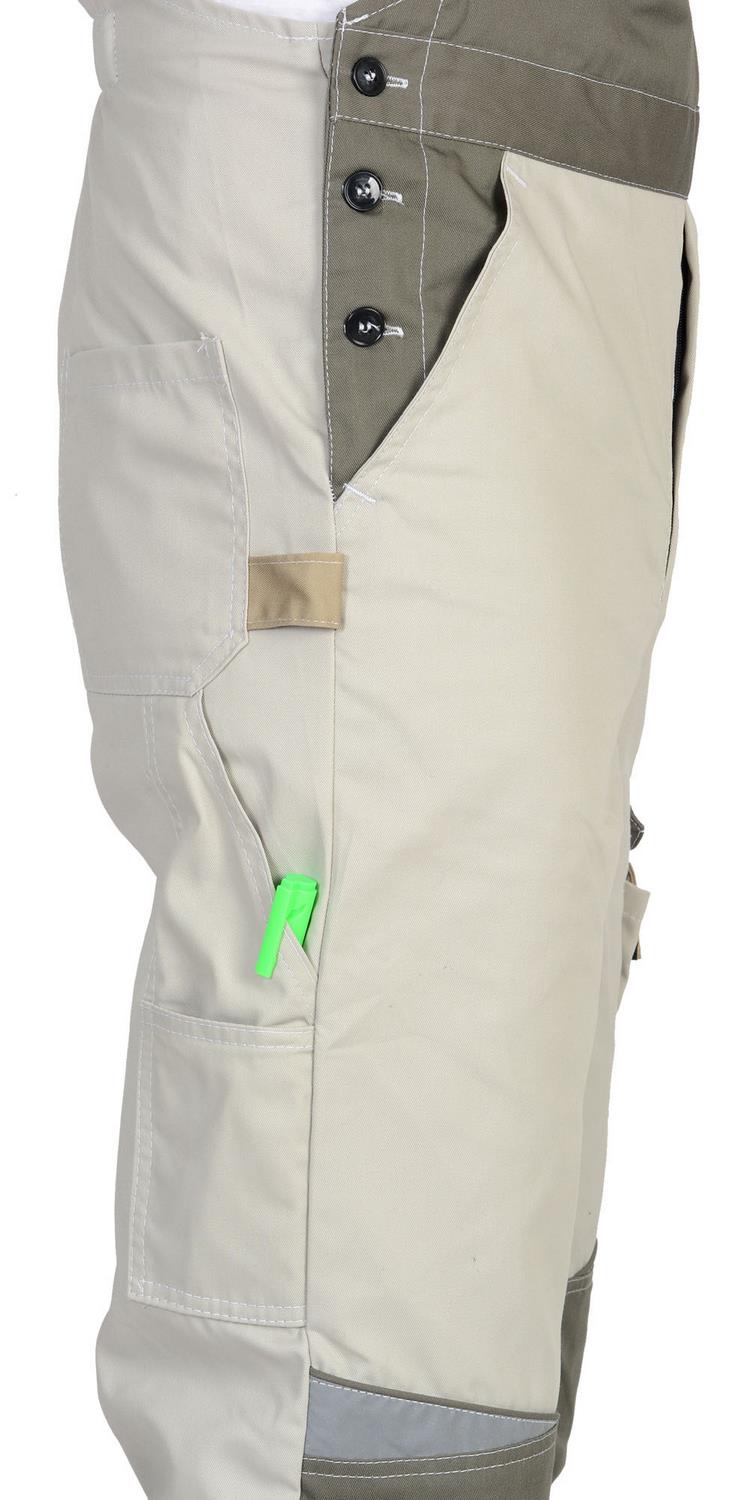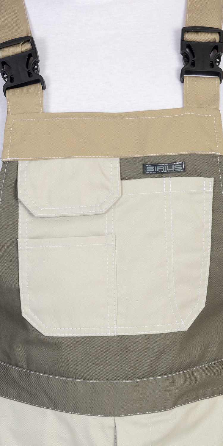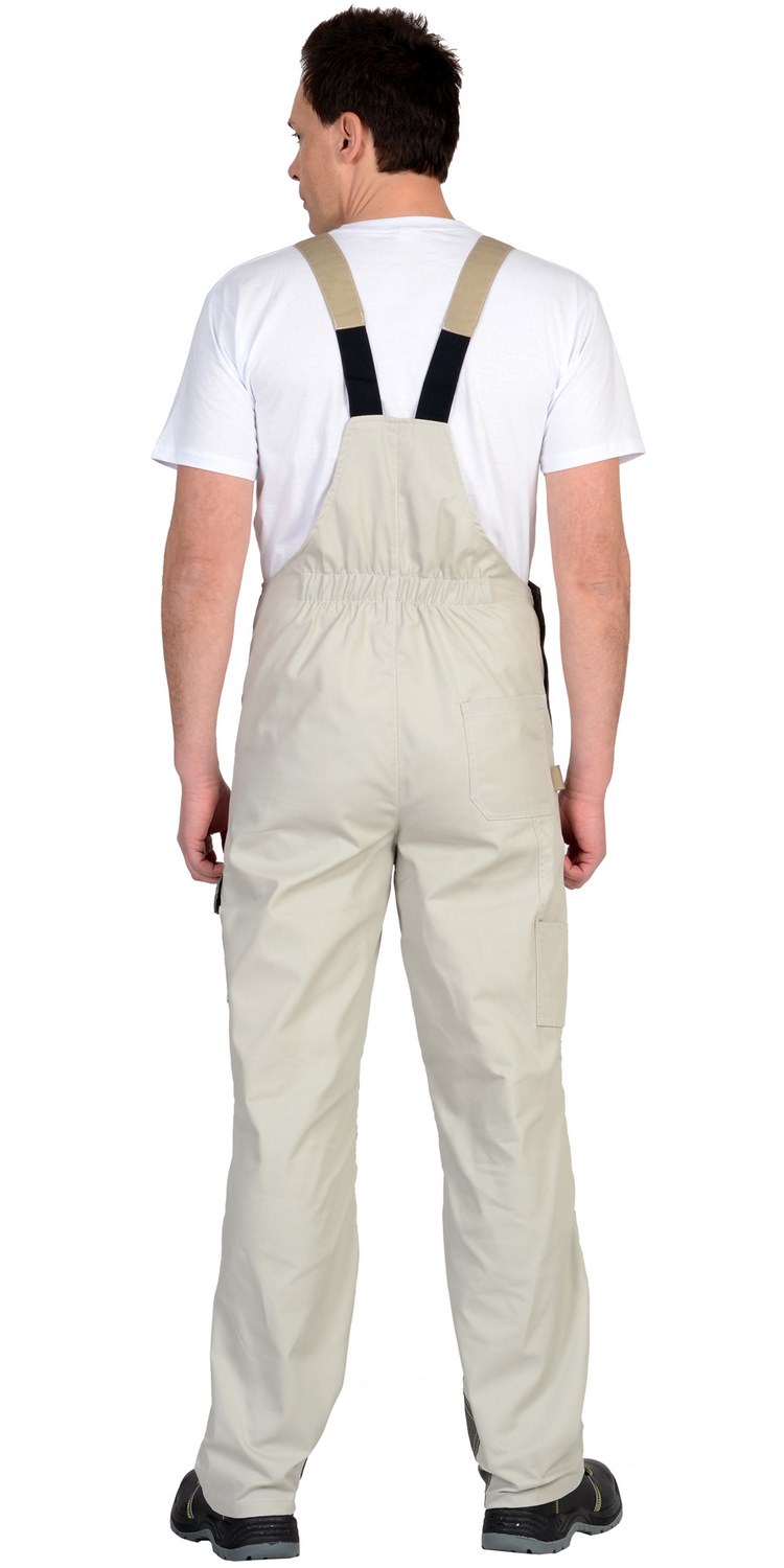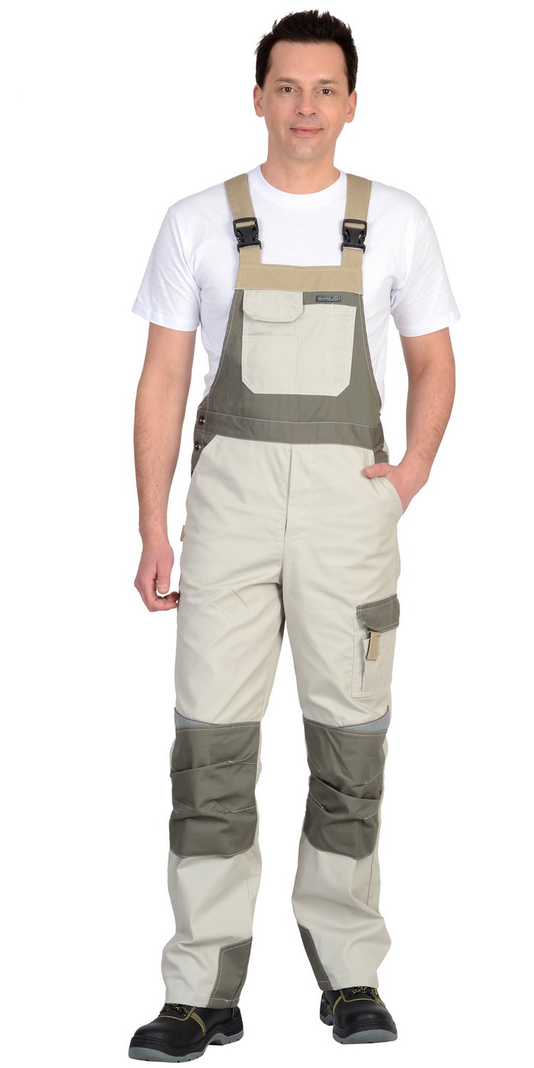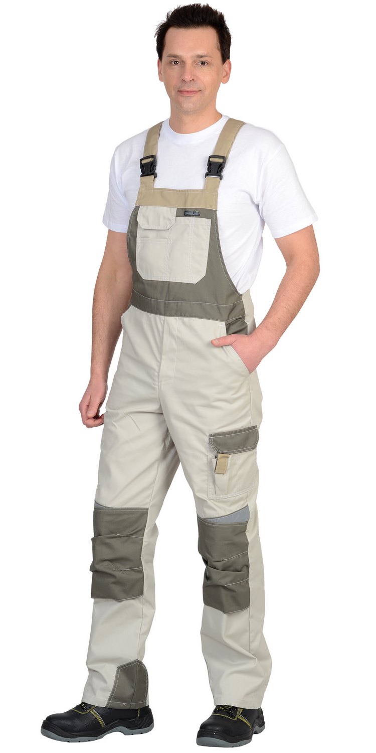 Полукомбинезон прямой с застёжкой спереди на «молнию» и с застёжкой в правом боковом шве на пуговицы, с отрезной грудкой, цельнокроенной спинкой, с бретелями. Передние половинки с объёмными наколенниками фигурной формы по верху. Задние половинки цельнокроеные, с верхним накладным карманом, с карманами для инструментов, настроченными один на другой, и шлёвкой для инструмента.