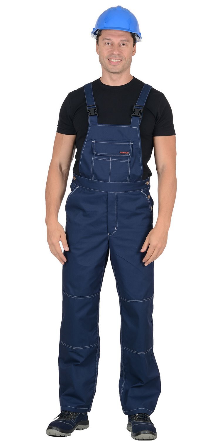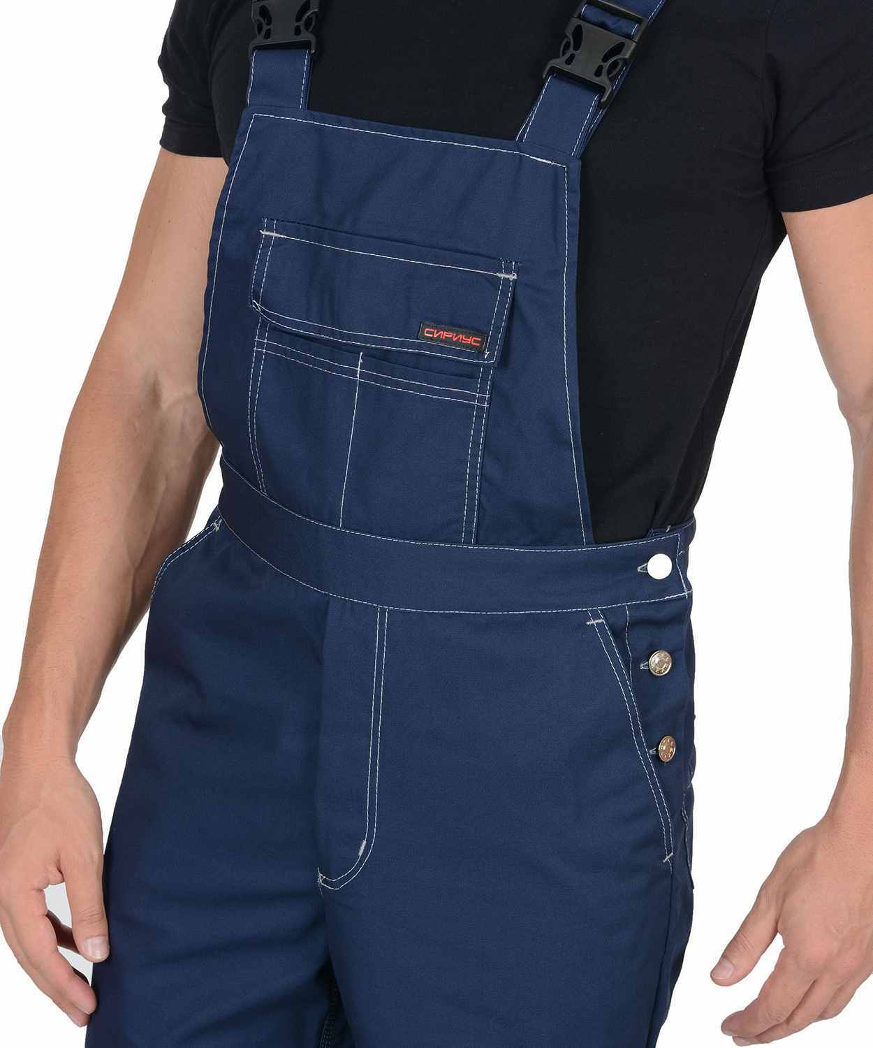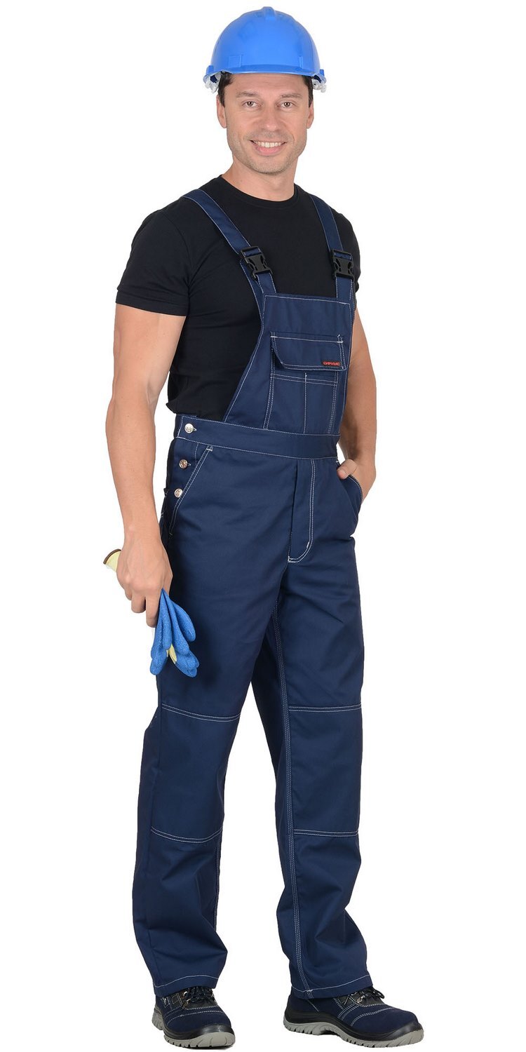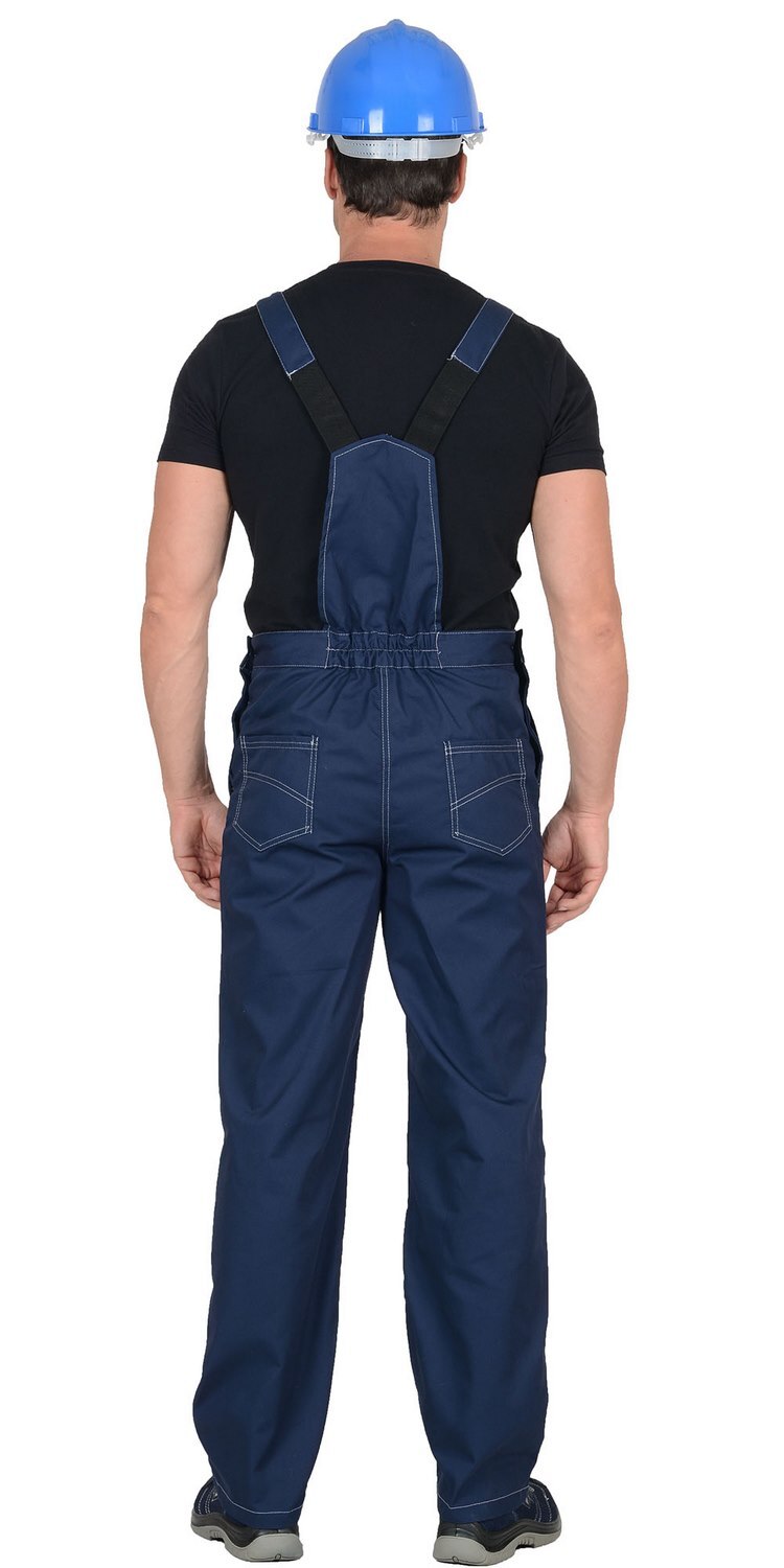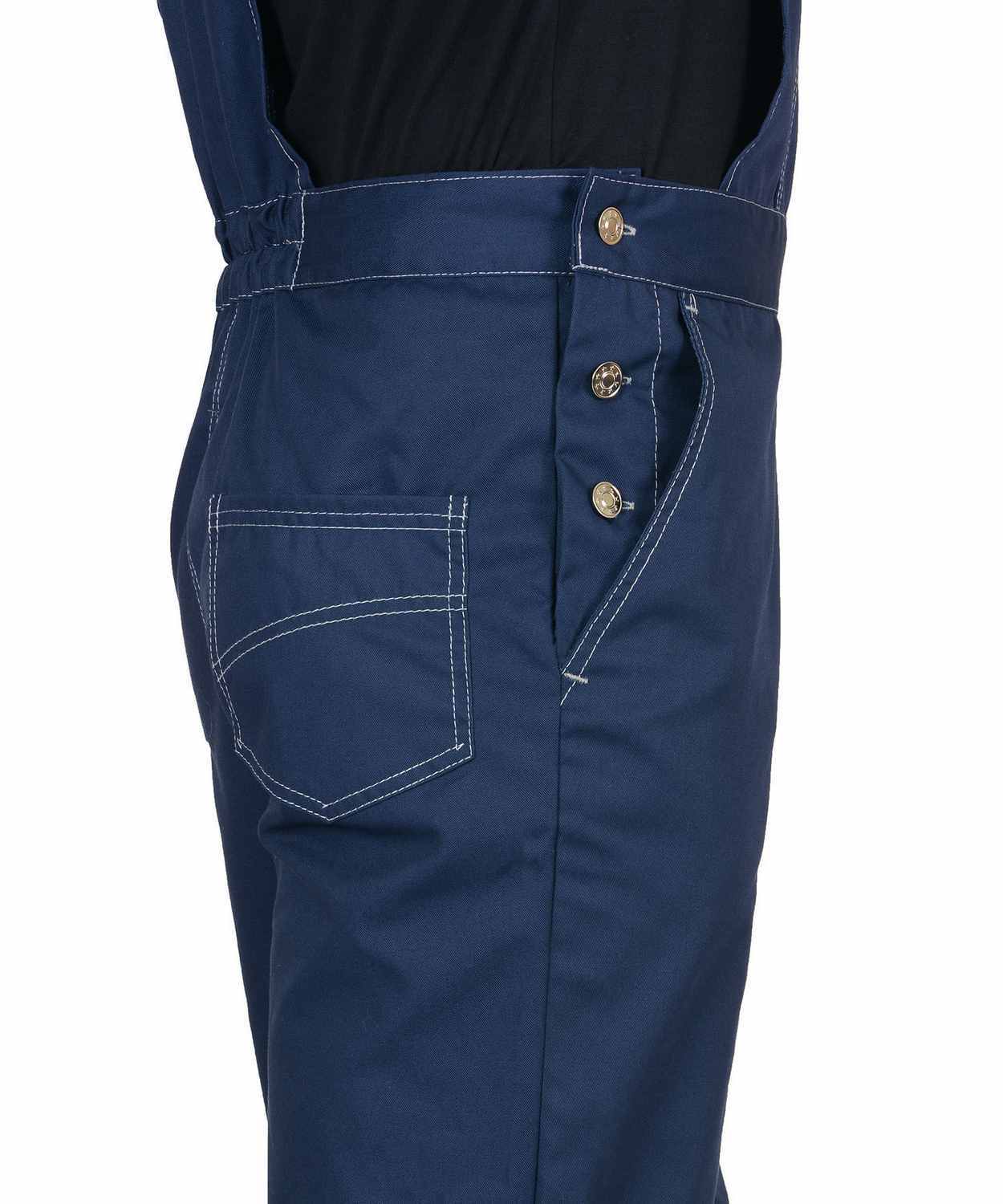 Полукомбинезон прямой, с притачным поясом, с застёжкой спереди на тесьму молния и с застёжками по обеим боковым швам на три петли и три пуговицы, с отрезными грудкой и спинкой, с бретелями.
