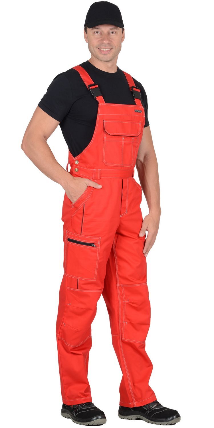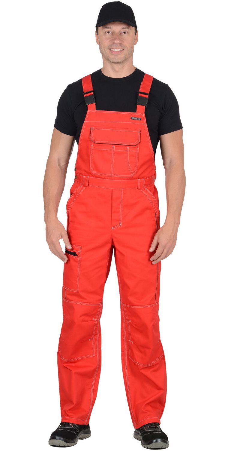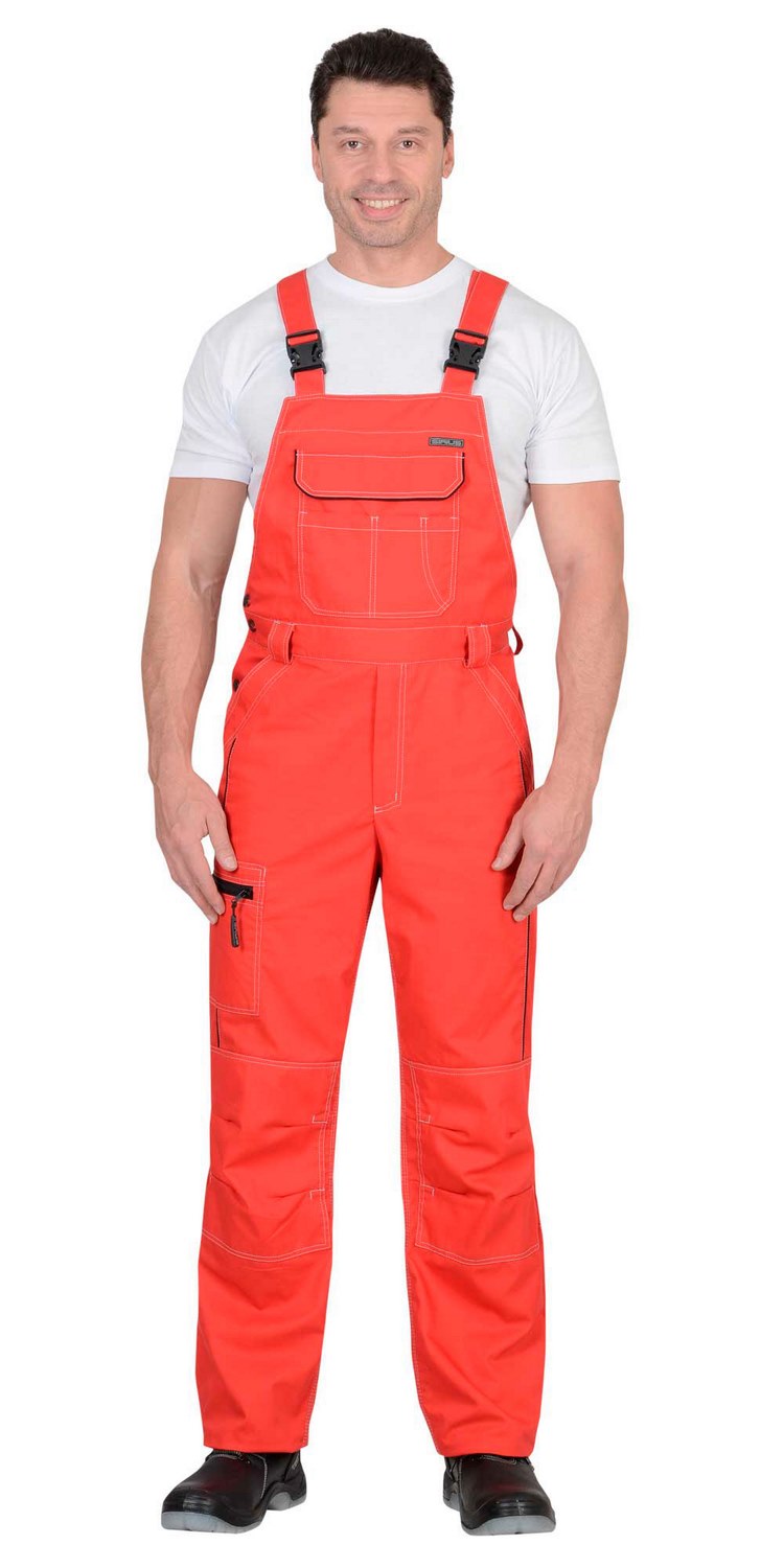 Полукомбинезон прямого силуэта, застежкой гульфика на молния, с различными многофункциональными карманами, с застежкой в правом боковом шве на пуговицы, с наколенниками, с бретелями регулируемыми эластичной тесьмой и фастексами, с эластичной тесьмой по линии талии, на передних половинках в рельеф вшивается СВ кант.