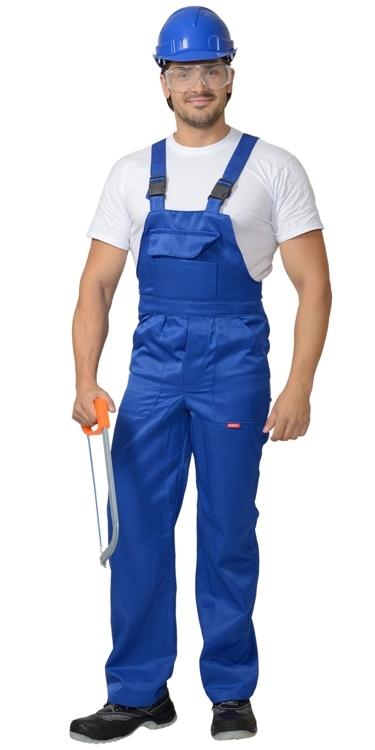 Полукомбинезон мужской. Нагрудный и нижний карманы с клапанами, карманы боковые и на задней правой части. Застёжка гульфика на пуговицы.