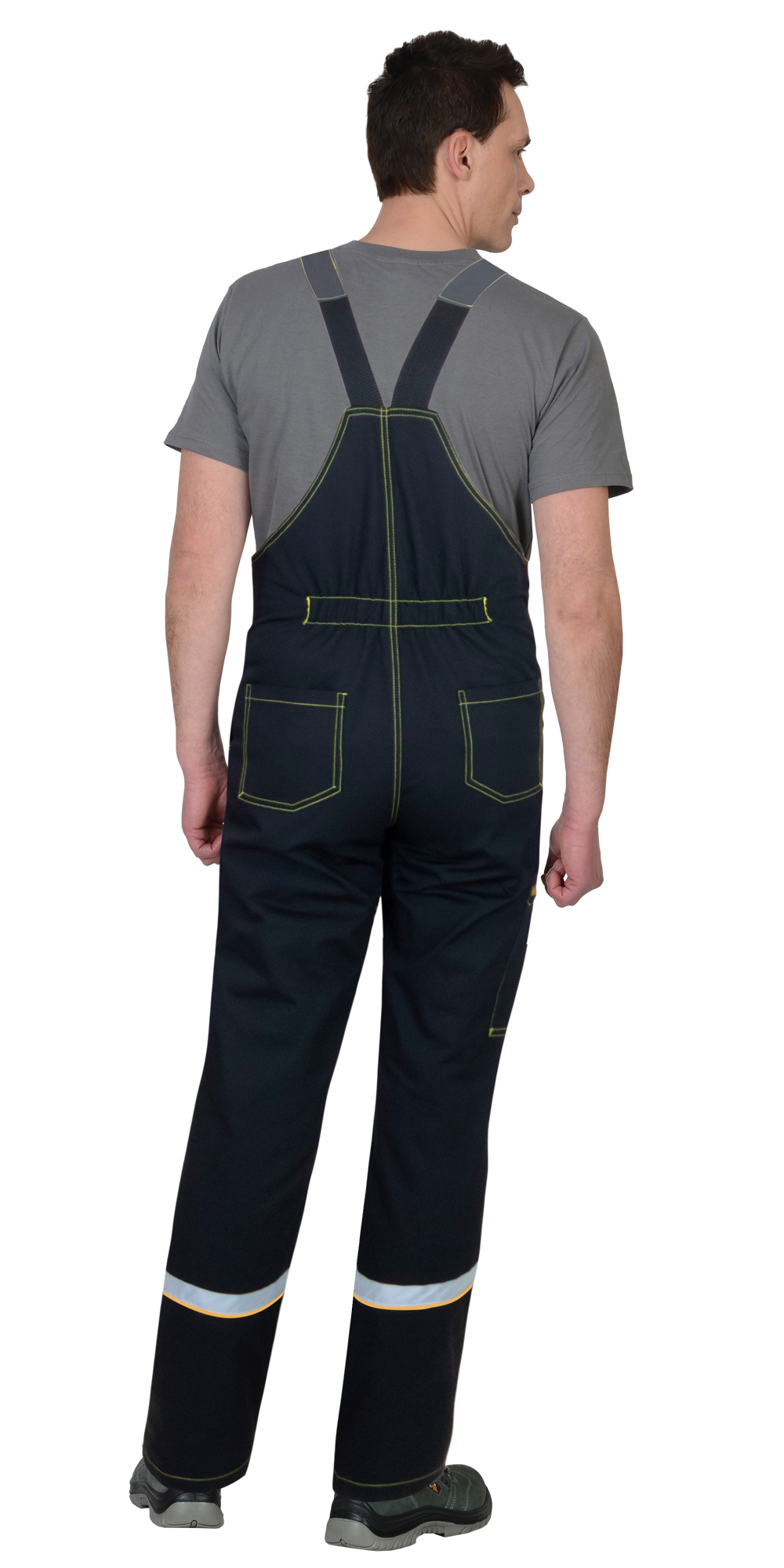 Полукомбинезон прямой, с застежкой спереди на молнию – гульфик и в правом боковом шве на пуговицы, с нагрудными, передними, задними карманами и карманом на правом боковым шве с молнией, с наколенниками, спинка с частичной стяжкой по талии, бретели регулируются при помощи застежек-фастексов и резинки. В полукомбинезоне предусмотрена лента светоотражающая для обозначения сигнальной видимости.