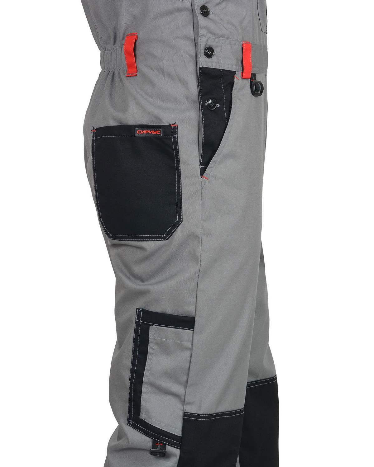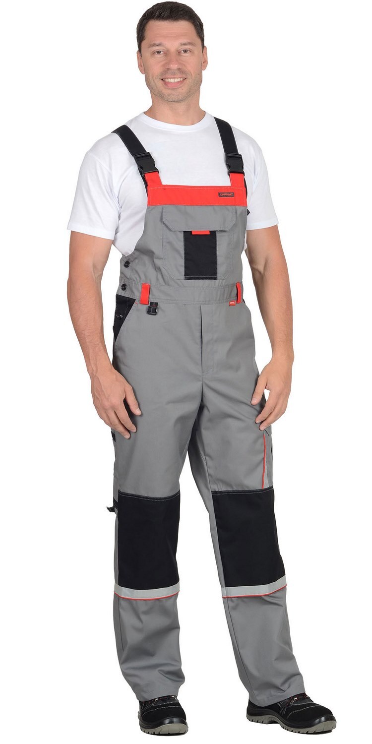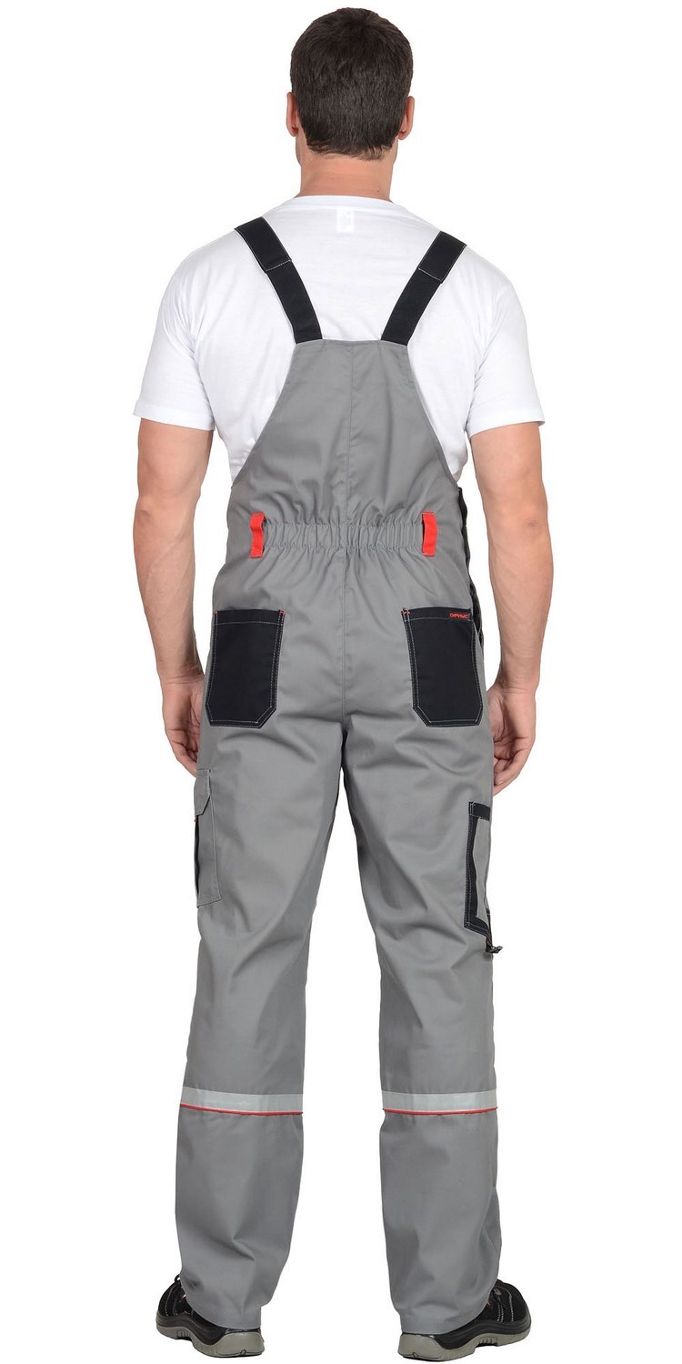 Полукомбинезон с бретелями, которые регулируются спереди с помощью пряжек-фастекс. Бретели из ткани и резинки сзади. Правая бокавая застежка на пуговицах. Центральная застежка на молнию. Грудка с большим накладным карманом с фигурным клапаном на липучку. Под поясом расположены боковые карманы. Слева на боковом шве расположен накладной объемный карман с фигурным клапаном на липучке. Спереди усилительные наколенники. Полукомбинезон сзади с накладными карманами, у бокового шва справа плоские накладные карманы для инструментов, один на другом, внизу которых декоративная тесьма с пряжкой. По талии спереди и сзади шлевки. Сзади резинка, для лучшего прилегания по фигуре.