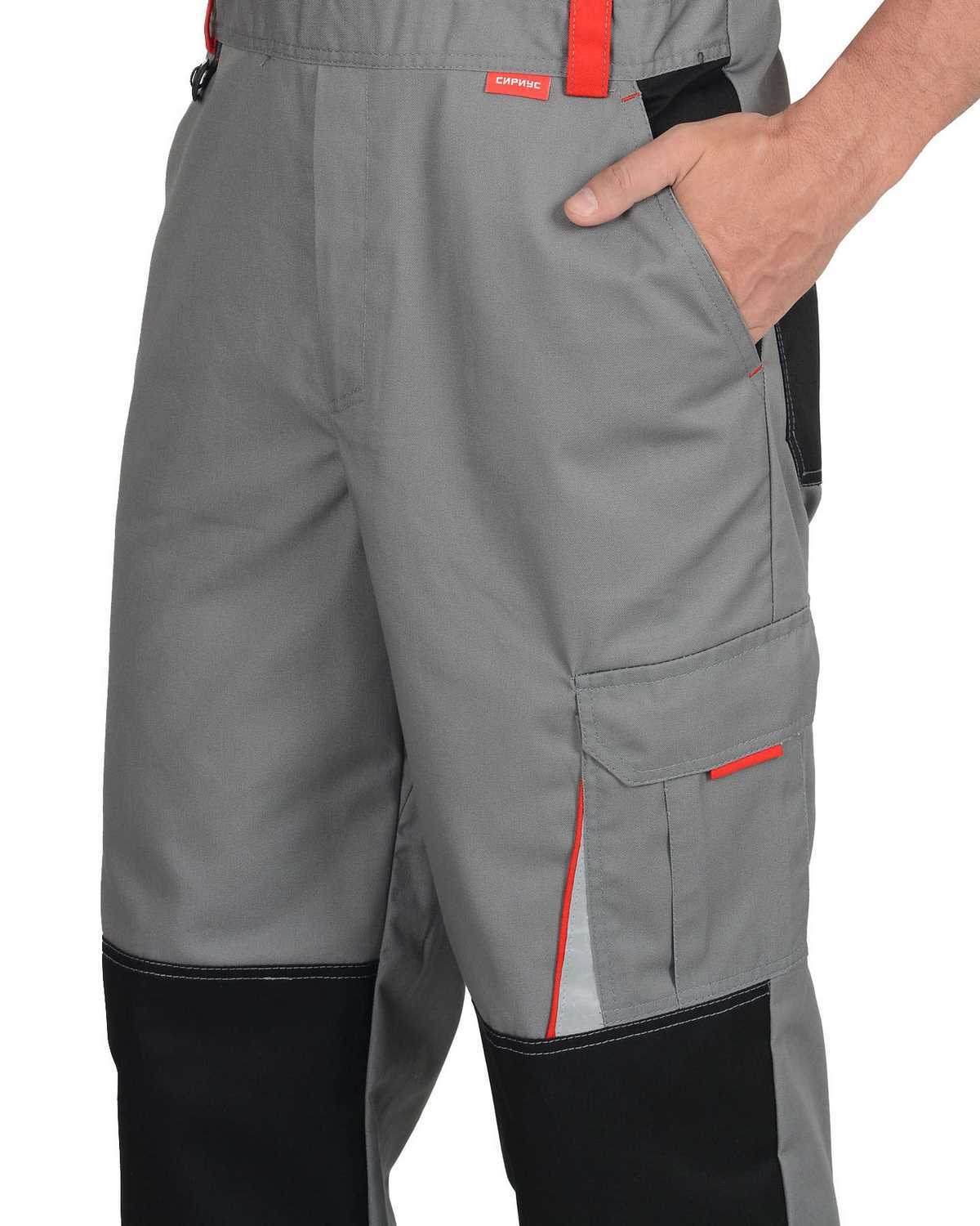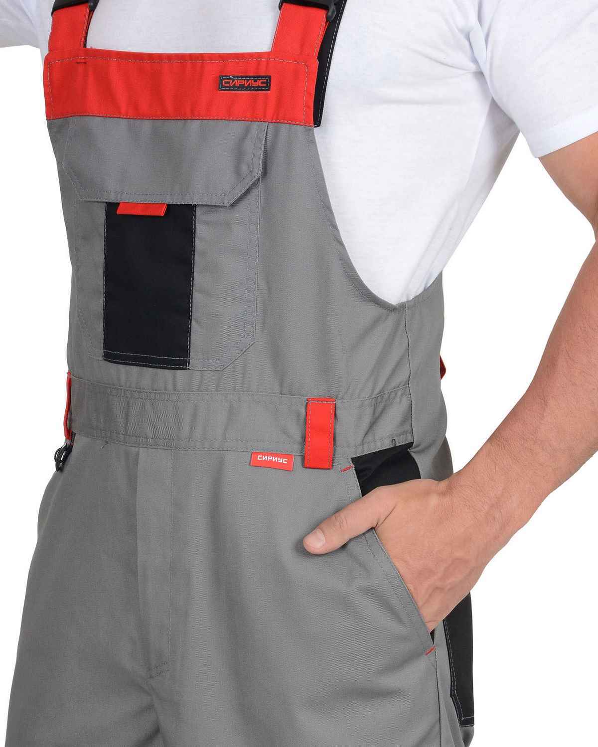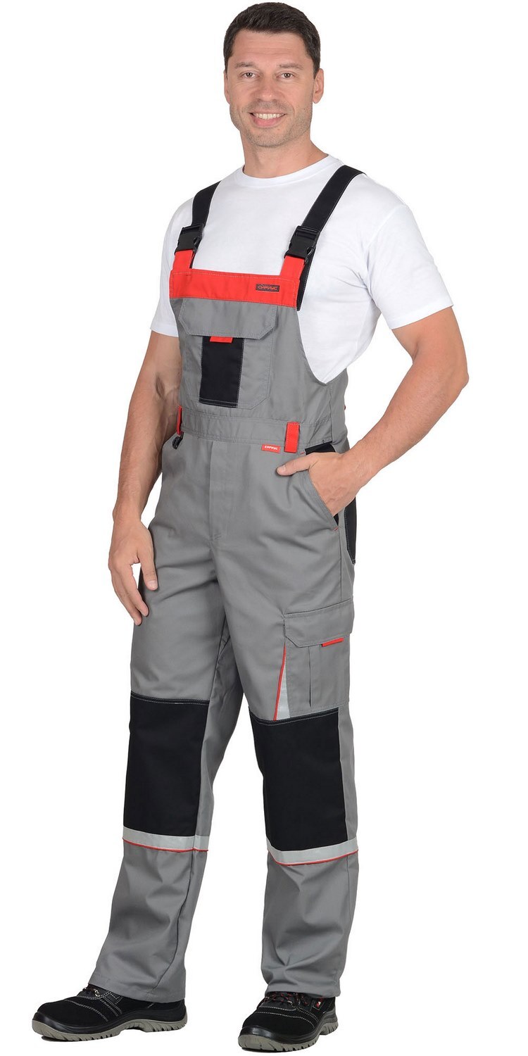 Полукомбинезон с бретелями, которые регулируются спереди с помощью пряжек-фастекс. Бретели из ткани и резинки сзади. Правая бокавая застежка на пуговицах. Центральная застежка на молнию. Грудка с большим накладным карманом с фигурным клапаном на липучку. Под поясом расположены боковые карманы. Слева на боковом шве расположен накладной объемный карман с фигурным клапаном на липучке. Спереди усилительные наколенники. Полукомбинезон сзади с накладными карманами, у бокового шва справа плоские накладные карманы для инструментов, один на другом, внизу которых декоративная тесьма с пряжкой. По талии спереди и сзади шлевки. Сзади резинка, для лучшего прилегания по фигуре.