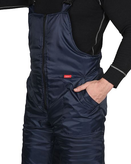Полукомбинезон прямой, с центральной застёжкой на двухзамковую тесьму - «молния», с накладными боковыми карманами, с эластичной лентой по спинке, для лучшего прилегания. Бретели регулируются при помощи эластичной ленты и пряжек фастексов.