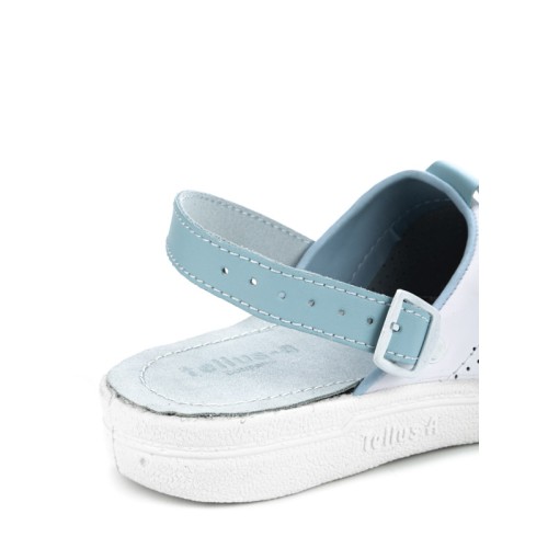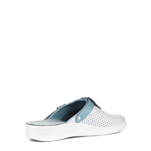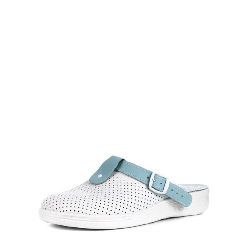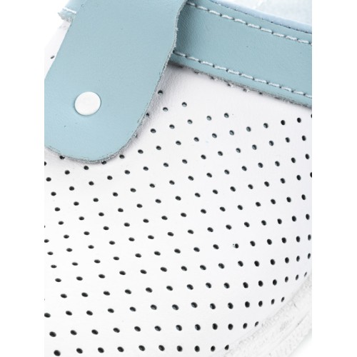 Сабо мужские белого цвета из натуральной кожи на ПУ подошве с голубым ремешком и натуральной стелькой