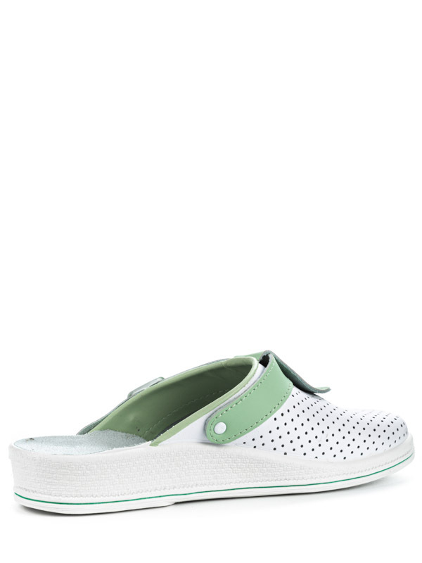 Универсальная модель, предназначена для медицинской, пищевой и иных промышленностей, для обслуживающего персонала. Наличие ремешка позволяет зафиксировать обувь на стопе Перфорация способствует вентиляции стопы.