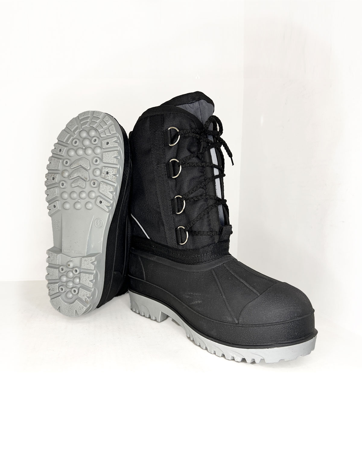 Общая высота- 30 см.Размеры с 39 по 47. Галоша, изготовлена методом двухкомпонентного литья, МБС, НС, КЩ20. Композитный подносок МУН 200. Специальный морозостойкий состав отечественного производства, стойкий к истиранию, антискользящий. Шпора для удобства снятия. Протектор, препятствующий скольжению. Комфортная температура до – 40. Голенище двухслойное. Ткань голенища – высокопрочный Оксфорд-Рип-Стоп с ВО и ПУ пропиткой плотность 440 г/м. Утепляющий слой - нетканое полотно. Укрепляющий подпятник. Светоотражающий кант по запятнику. Метод крепления - прошивной через стропу, в две строчки нитками ЛЛ, ЛХ на 100. Утепляющий чулок – многослойный: Триплированное нетканное фольгированное полотно укреплено армирующей сеткой с полушерстяным мехом (30% на 70%). Утепляющая войлочная стелька в галоше. Фиксация на ноге – шнурками через полукольца. Возможна комплекатция антипрокольной кевларовой стелькой.