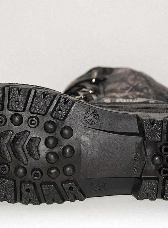 Голенище двухслойное, утеплено нетканым полотном плотностью 350 гр./м. кВ.. Ткань голенища- высокопрочный Оксфорд, цвет- камуфляж, с ВО пропиткой. Форма голенища анатомическая.