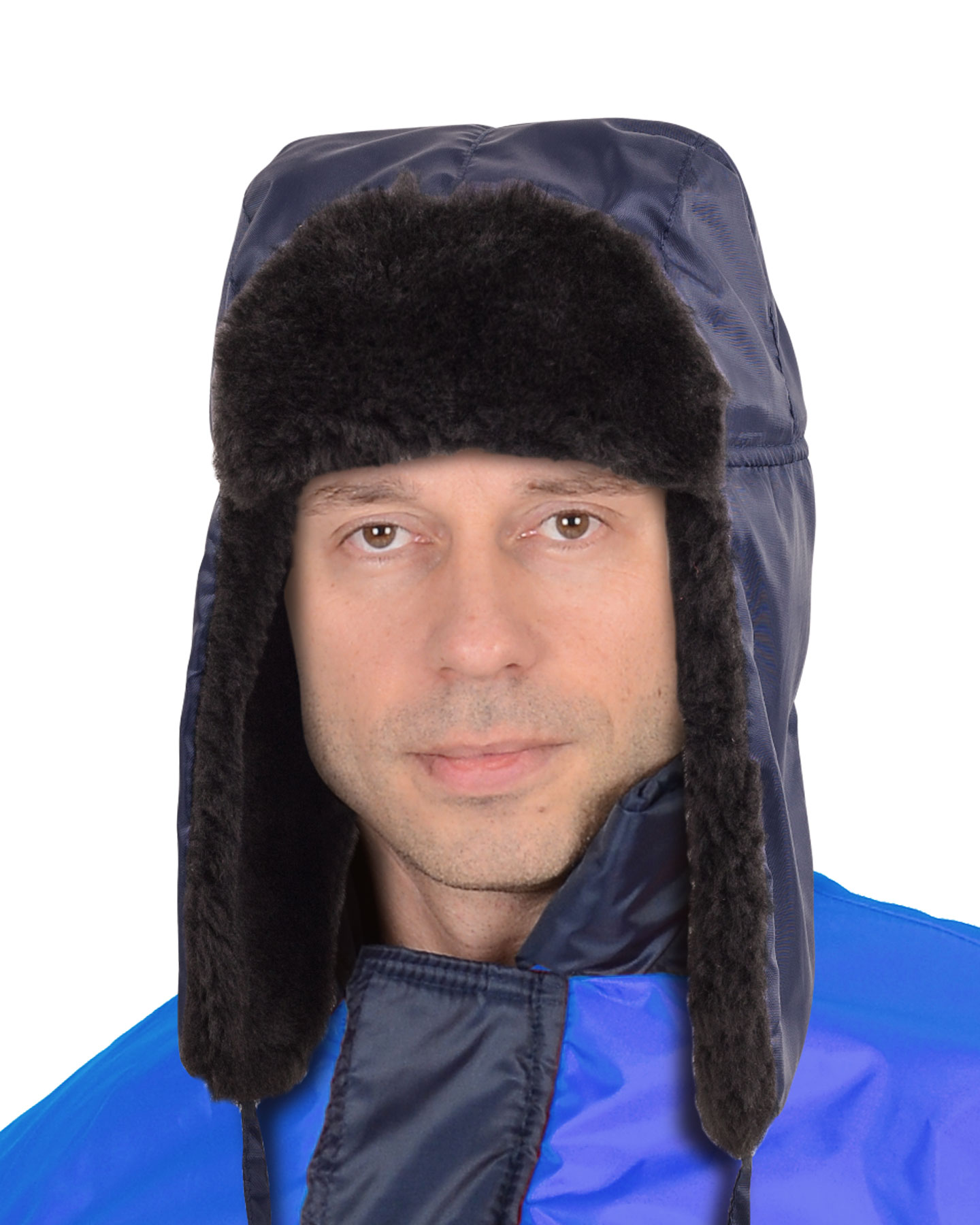 Шапка-ушанка зимняя темно-синяя с искусственным мехом черного цвета. В затылочной части объем регулируется за счет резинки и фиксатора.
